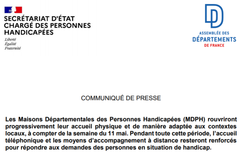 PDF: https://handicap.gouv.fr/IMG/pdf/11052020_-_cp_reouverture_progressive_des_mdph.pdf
