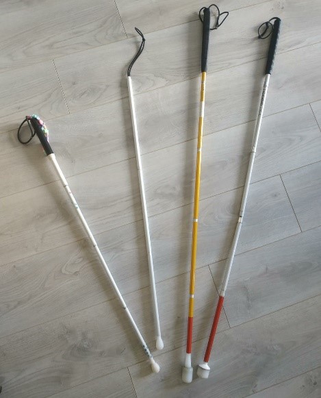 - Des cannes d’appui peuvent également être proposées. Elles permettent le maintien d’un bon équilibre et de s’identifier mais ne pourra pas détecter les obstacles au sol.