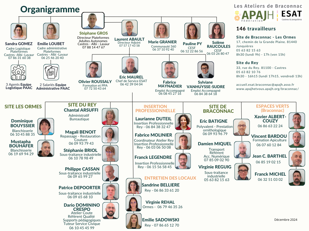 Notre équipe 8790 0 Les professionnels des ateliers de Braconnac Sous la direction de Laurent ABAULT, 24 professionnels accompagnent les travailleurs en situation de handicap des ateliers de Braconnac.
