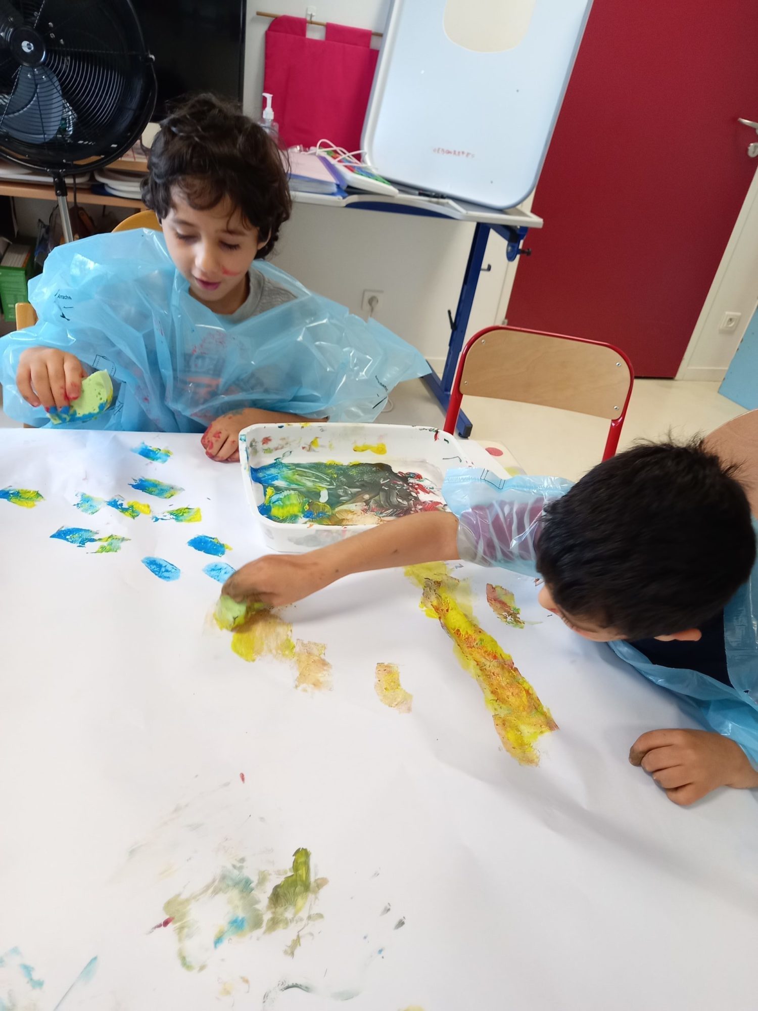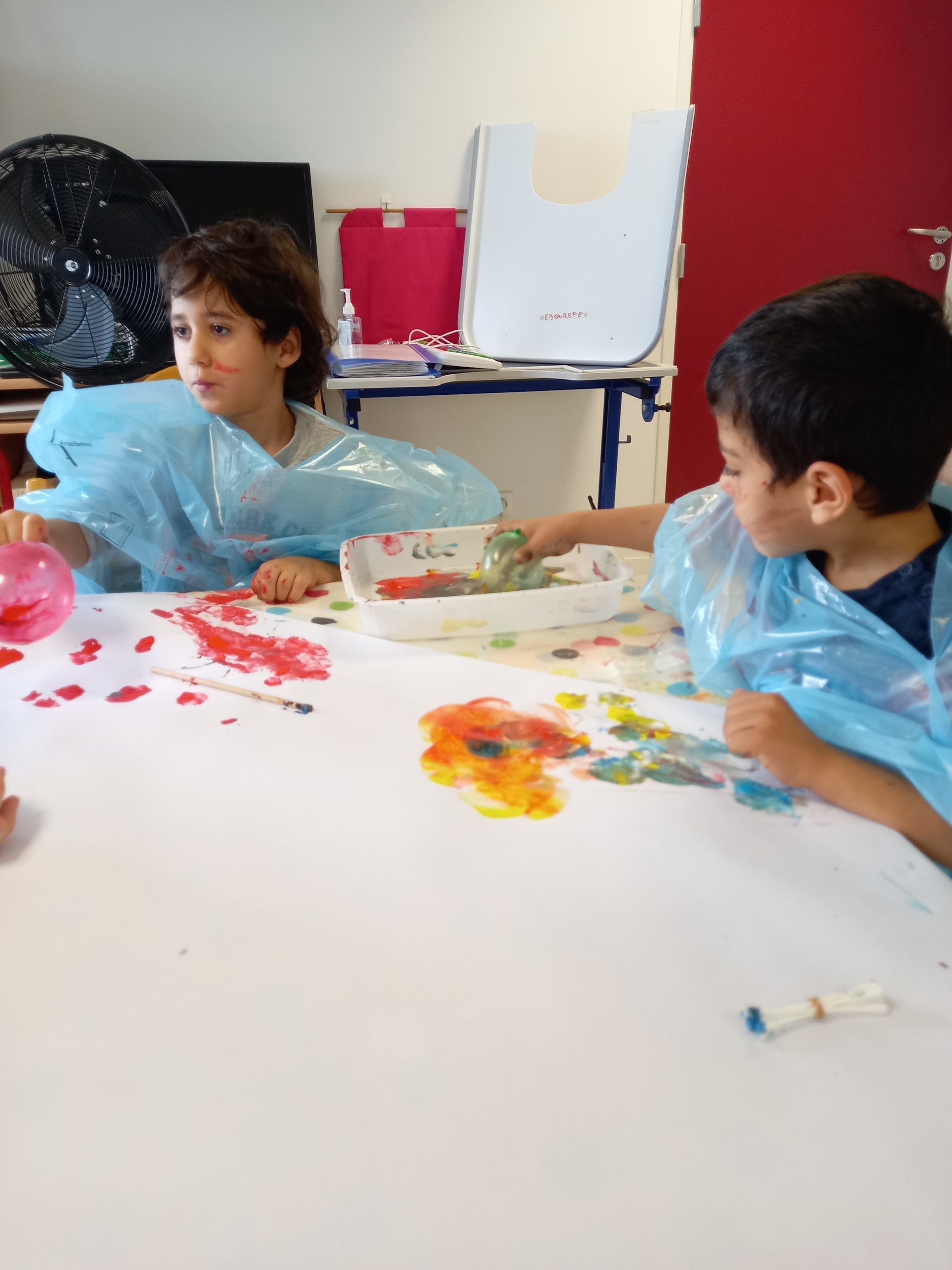 Les artistes au travail. Adam et Ismaël ont peint avec leurs doigts, des pailles, des coton-tiges et des ballons.