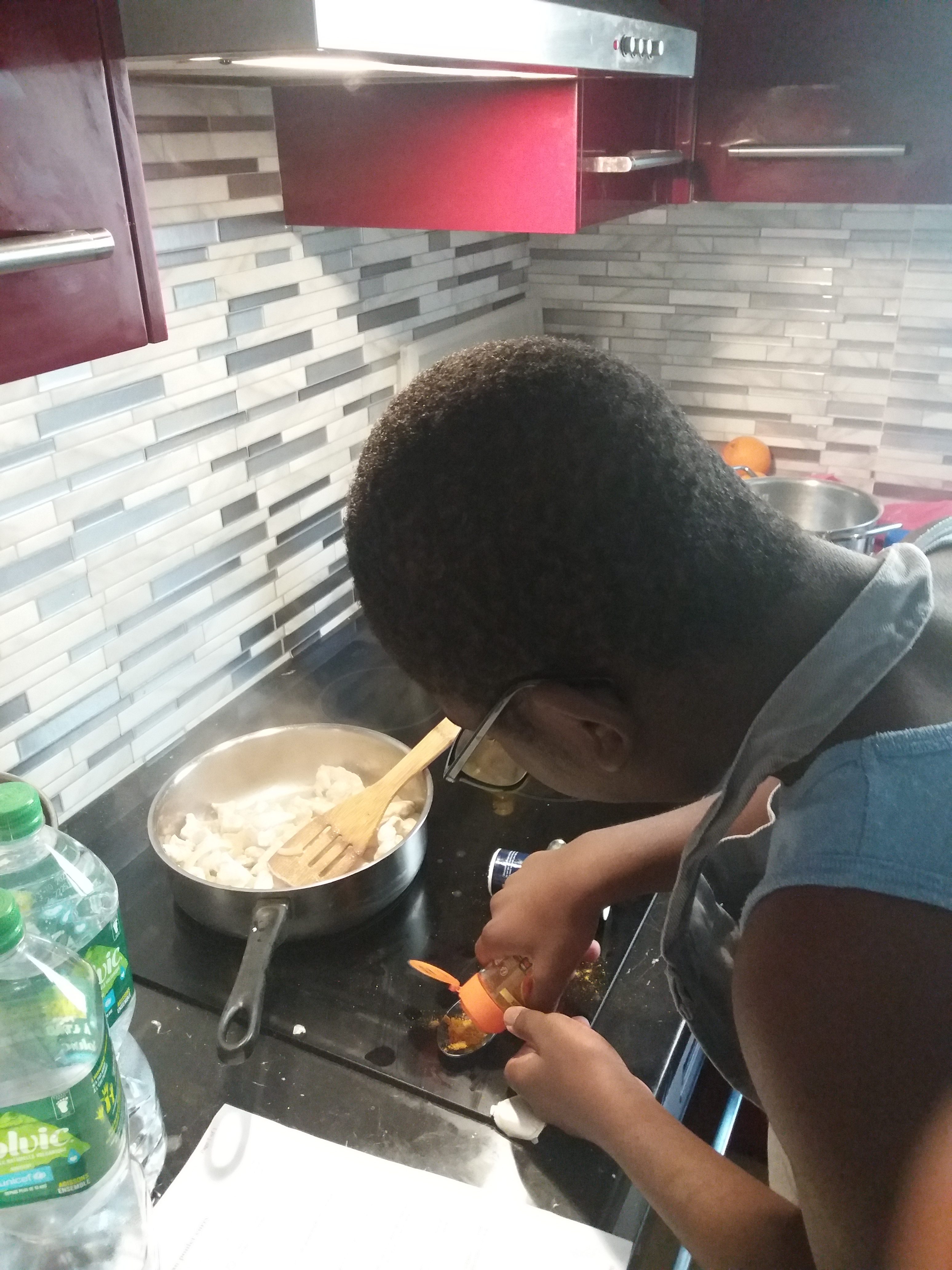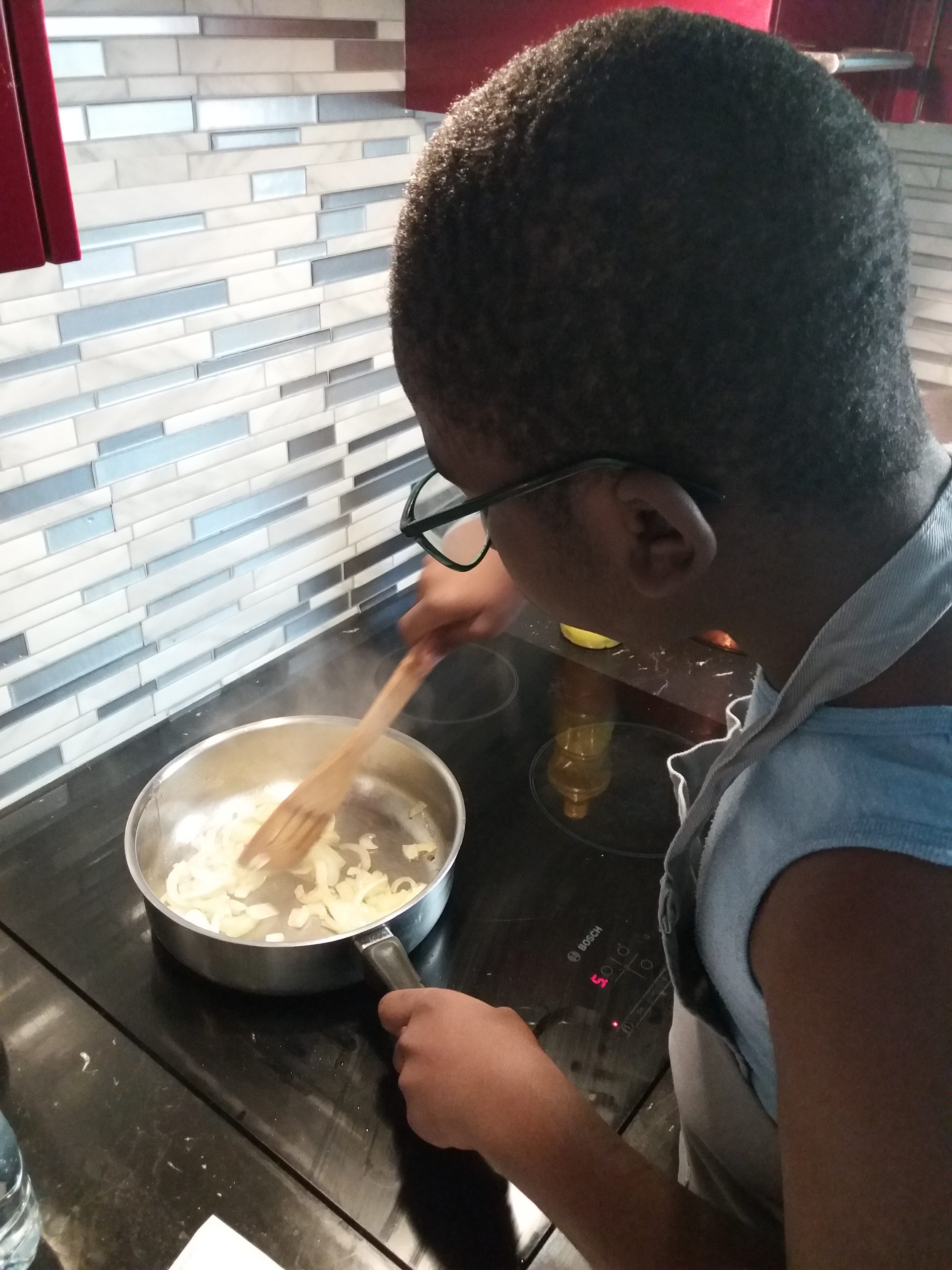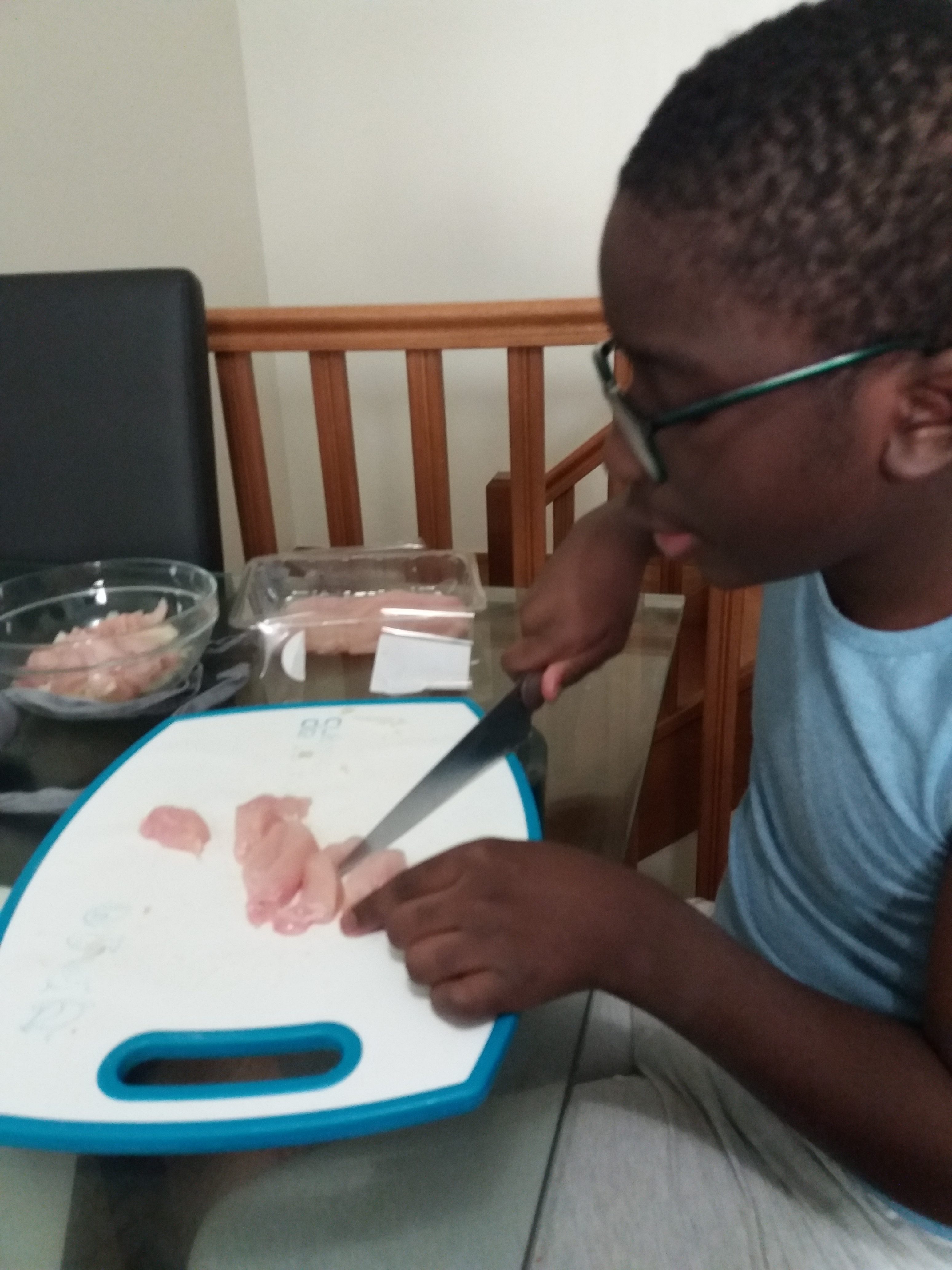 Atelier autonomie. Juelson a souhaité apprendre à préparer des tacos au poulet-curry. Pour cela, il a coupé des oignons, des escalopes de poulet qu’il a ensuite fait revenir à la poêle. Il a ensuite fait une sauce au curry. Il a ensuite réalisé un pliage en règle après avoir garni sa galette de maïs. Le tout ira ensuite au four après une bonne couche de fromage râpé !!! un régal…