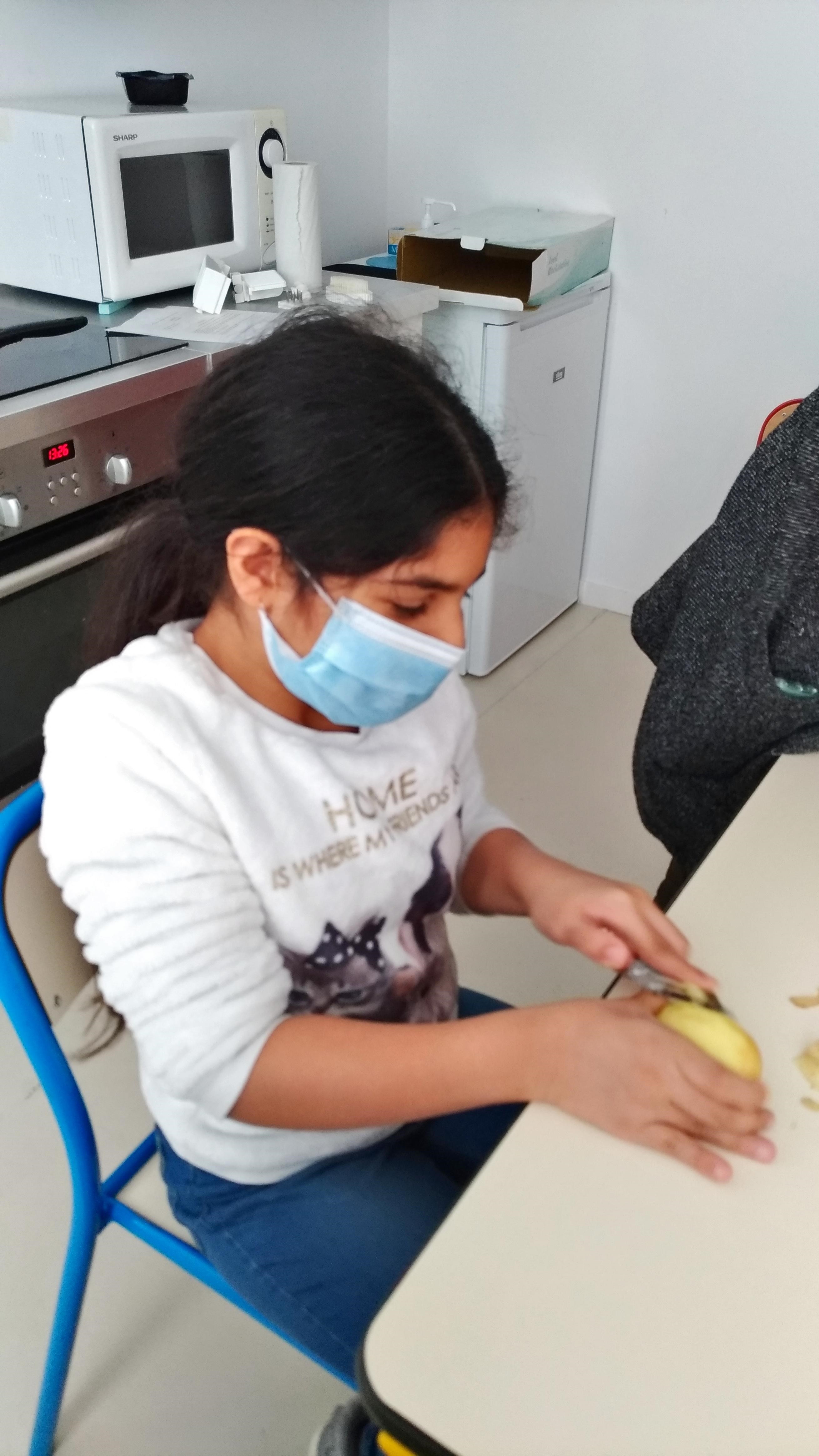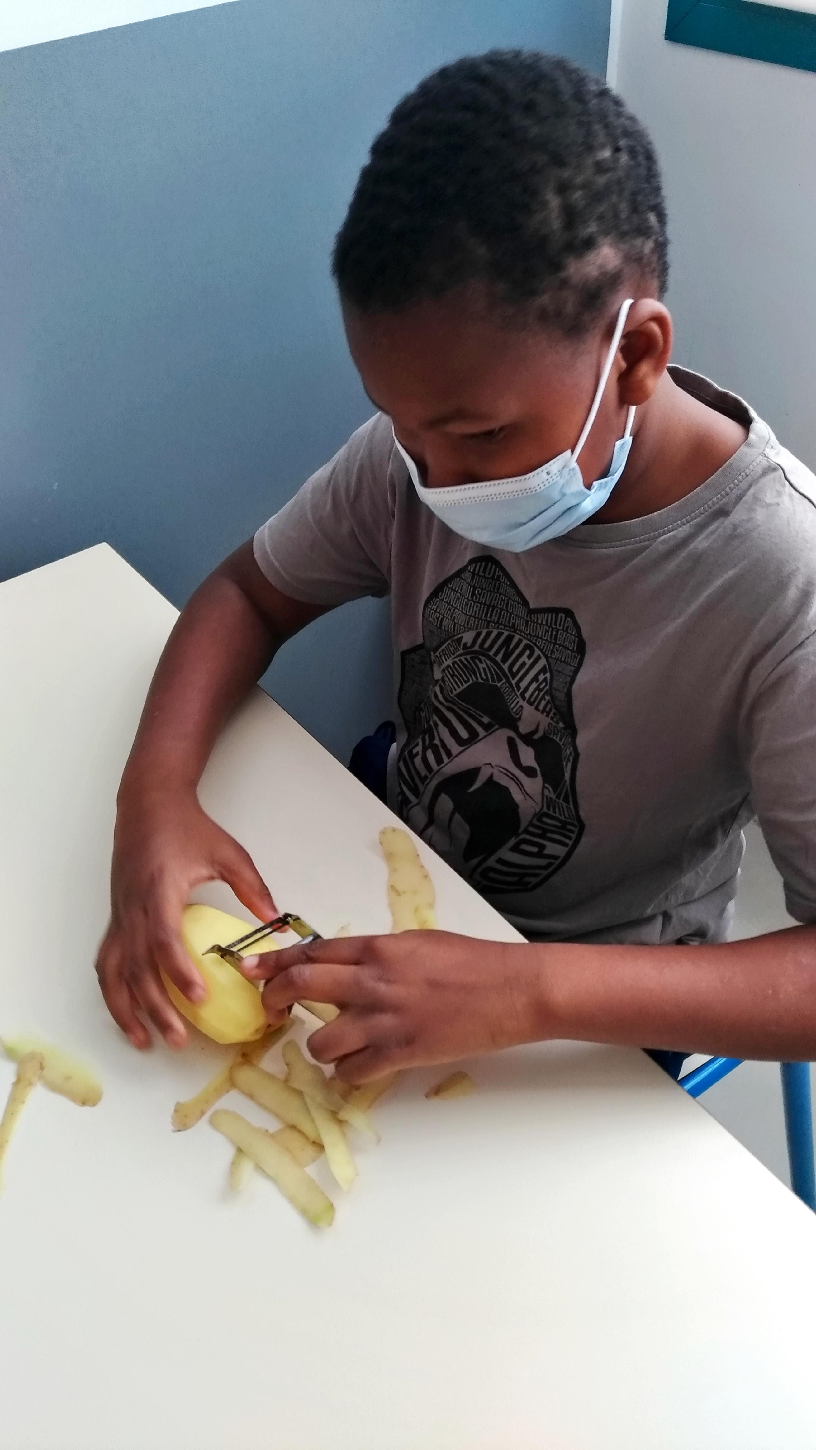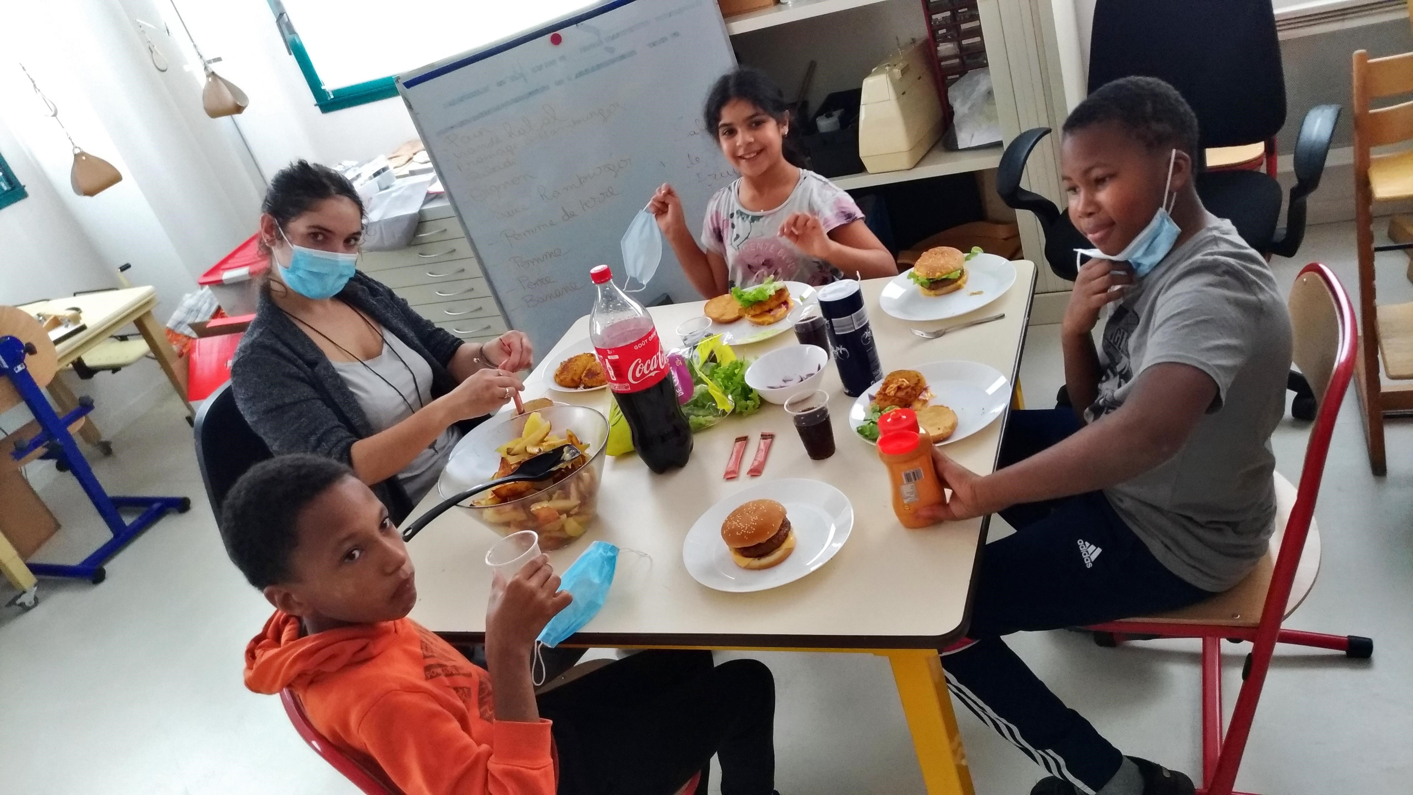Atelier cuisine pour les enfants qui ont choisi ensemble de réaliser un hamburger maison accompagner de frites et une salade de fruit pour le dessert.