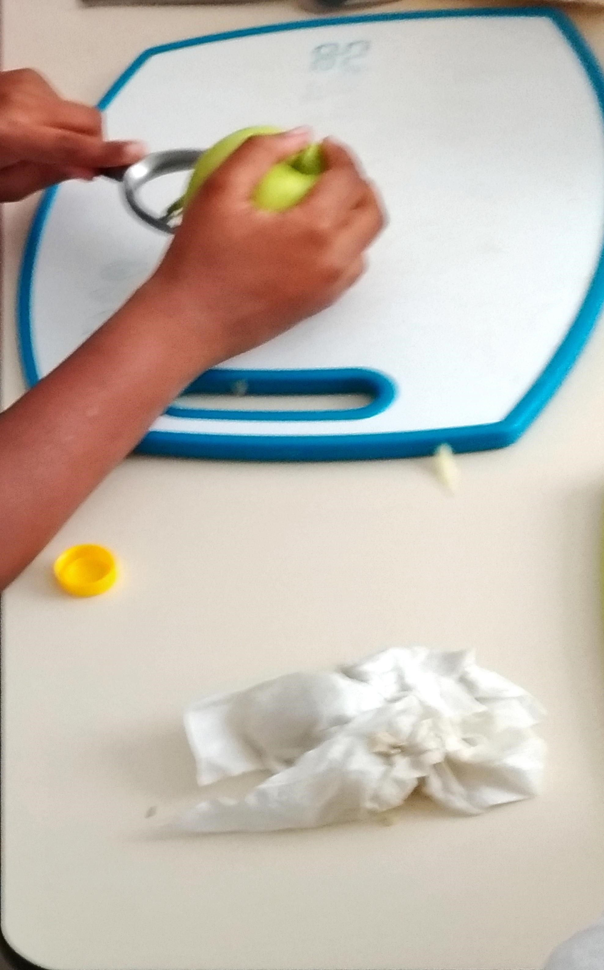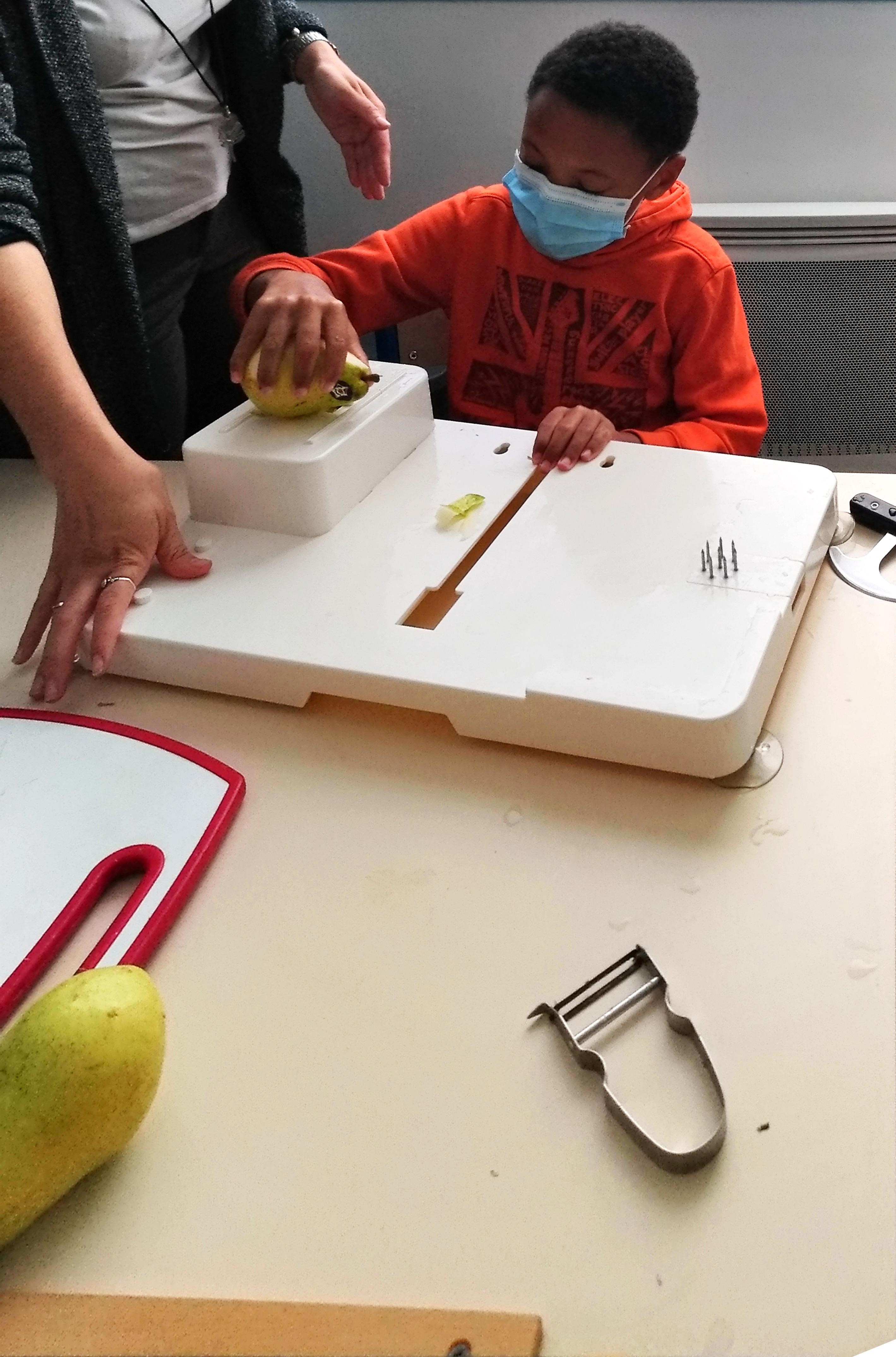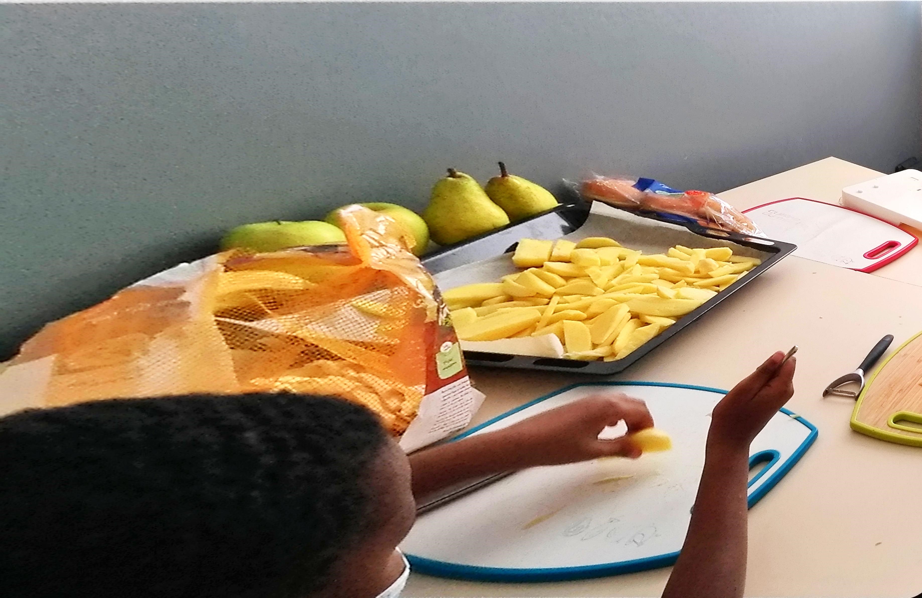 Atelier cuisine pour les enfants qui ont choisi ensemble de réaliser un hamburger maison accompagner de frites et une salade de fruit pour le dessert.