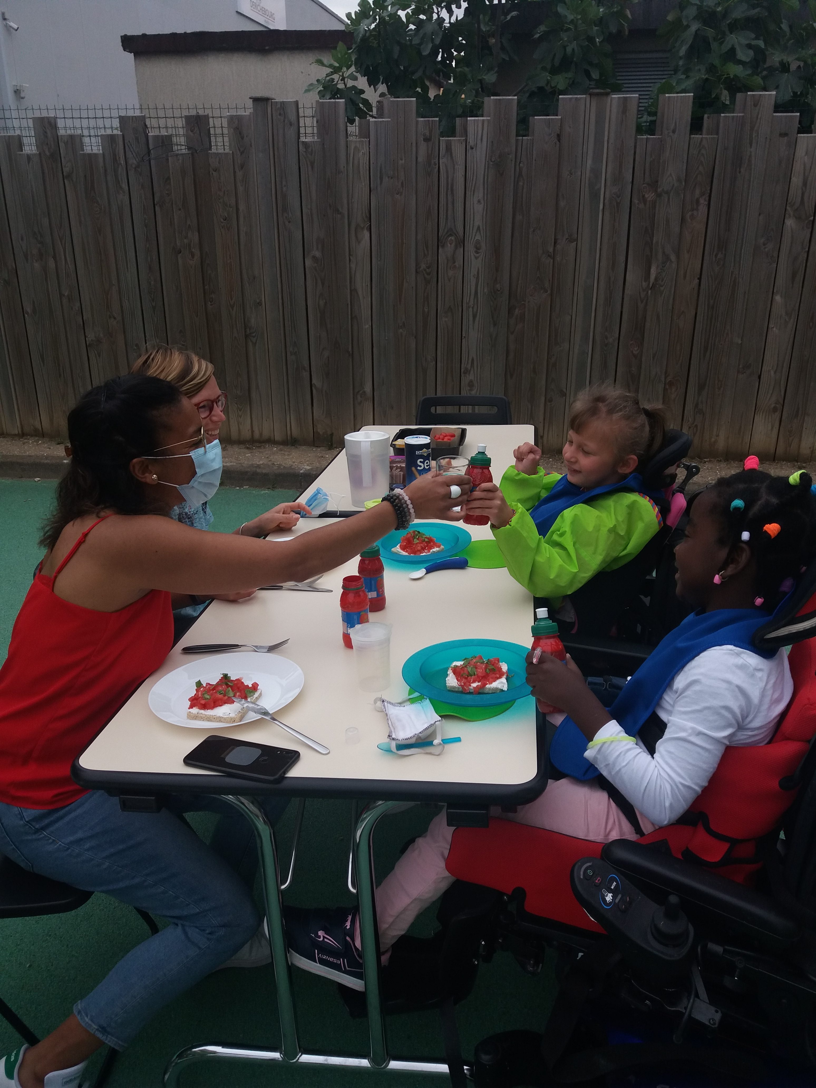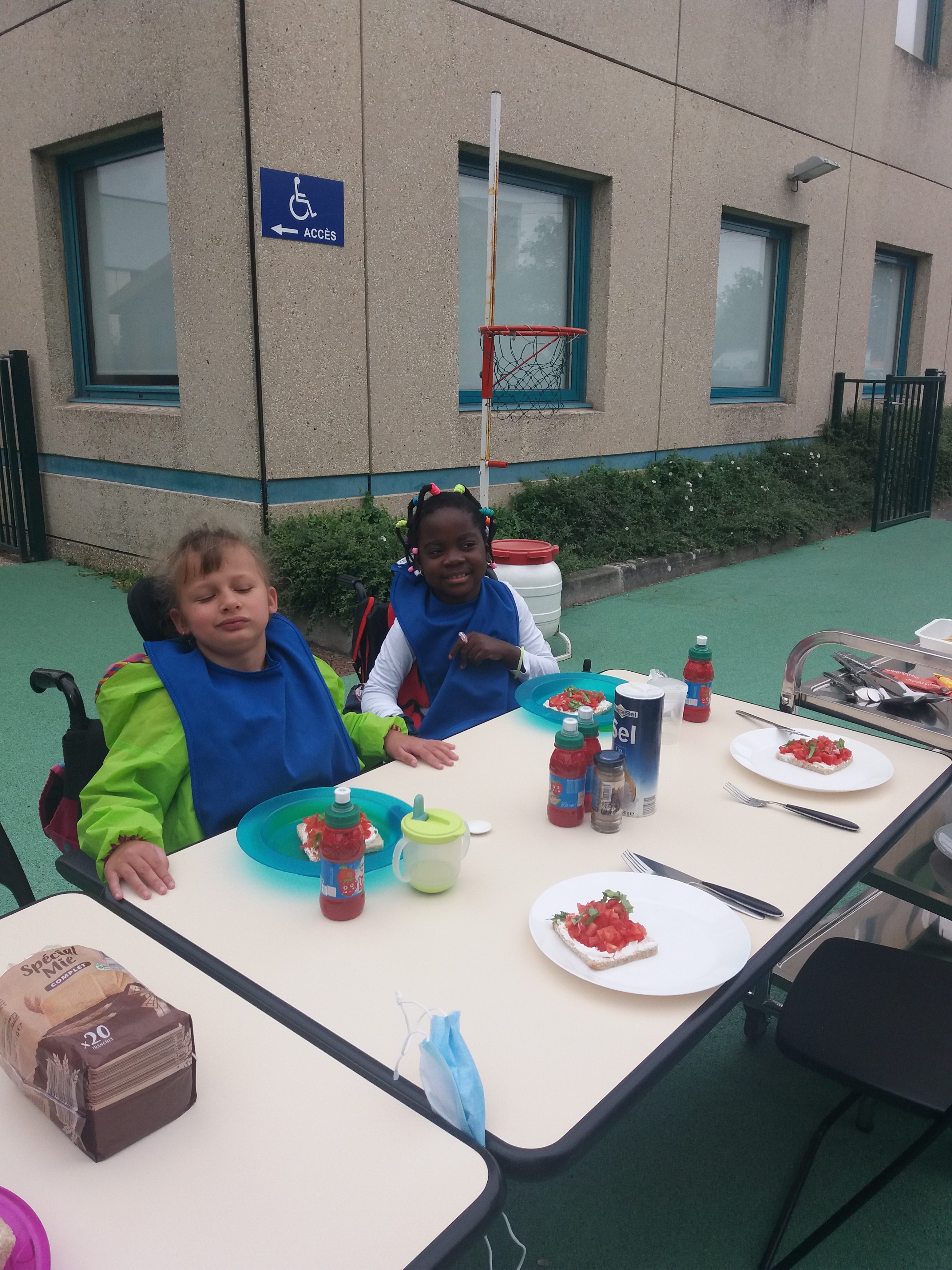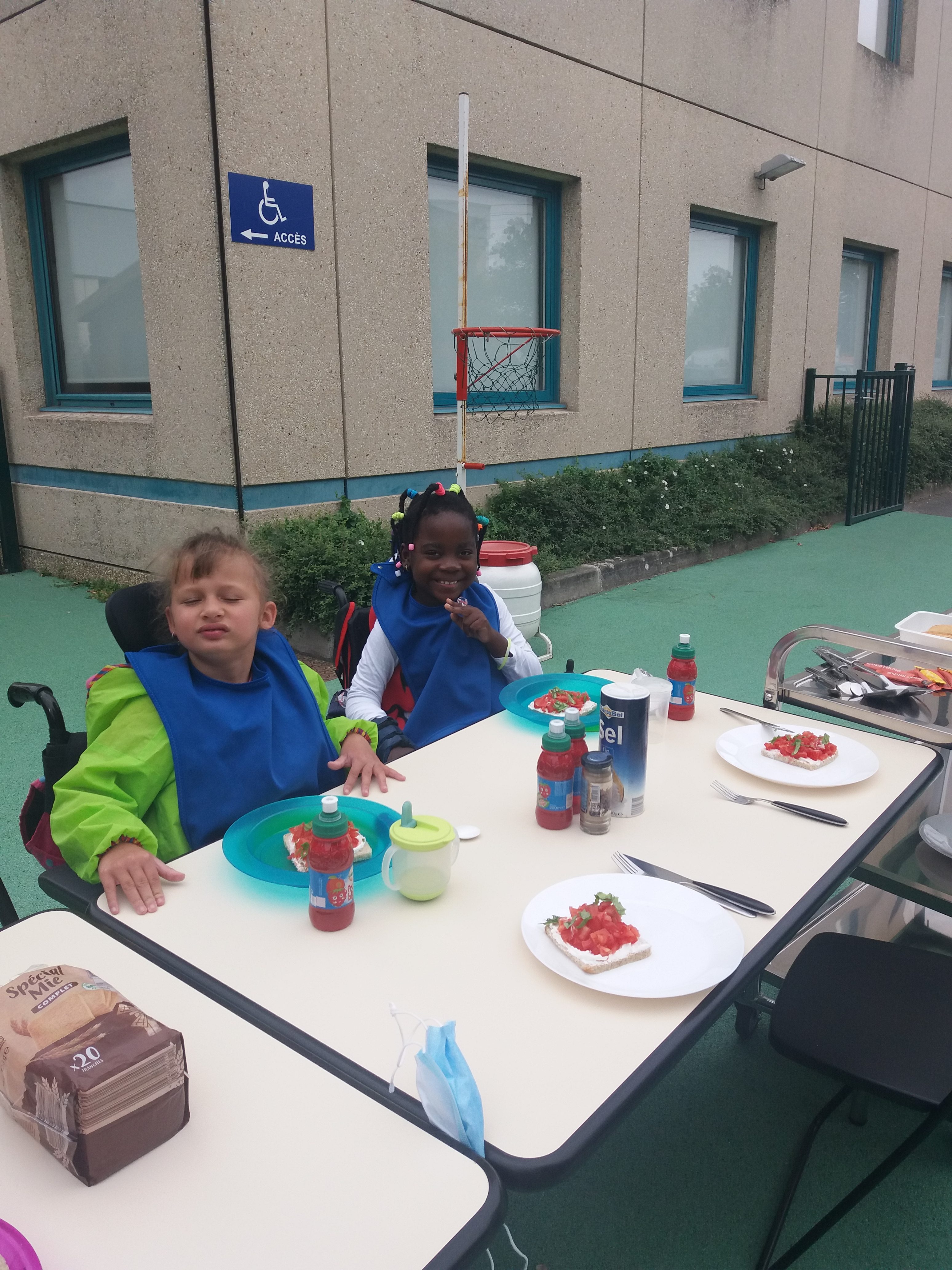 A l'IEM 566 0 Cuisine Préparation d’une entrée pour ce dernier jour avant les vacances pour Sublime et Milana. Au menu: tomate, basilic, chèvre toasté…