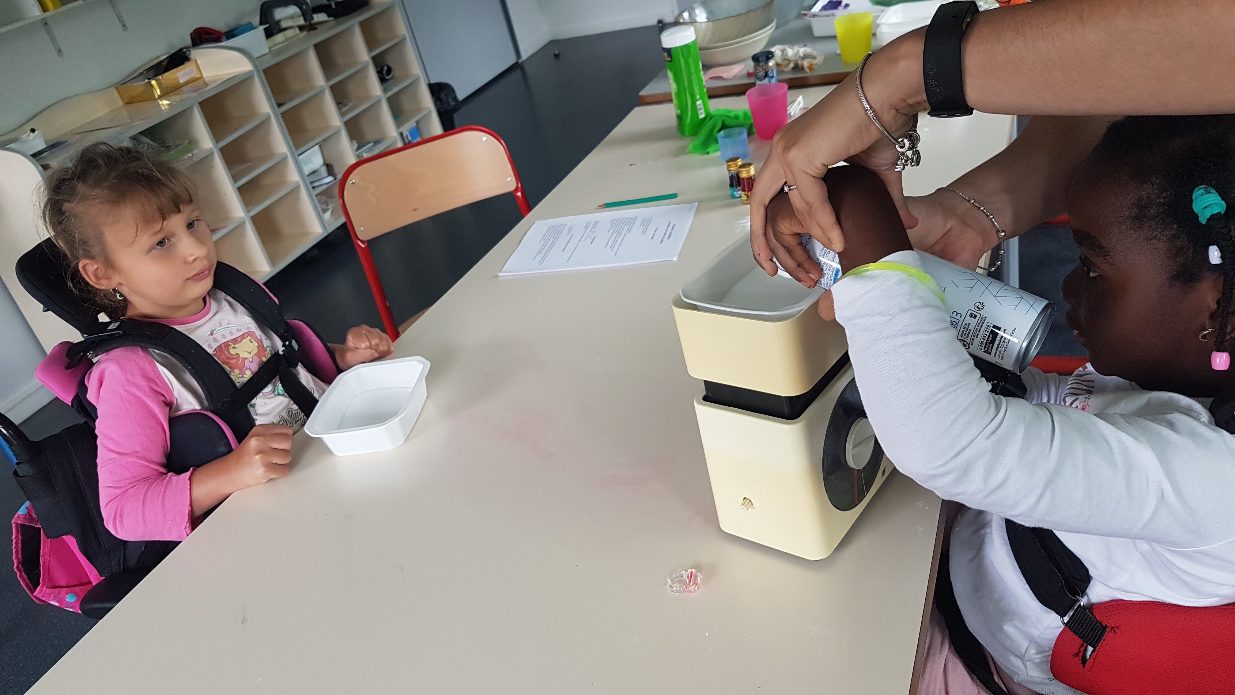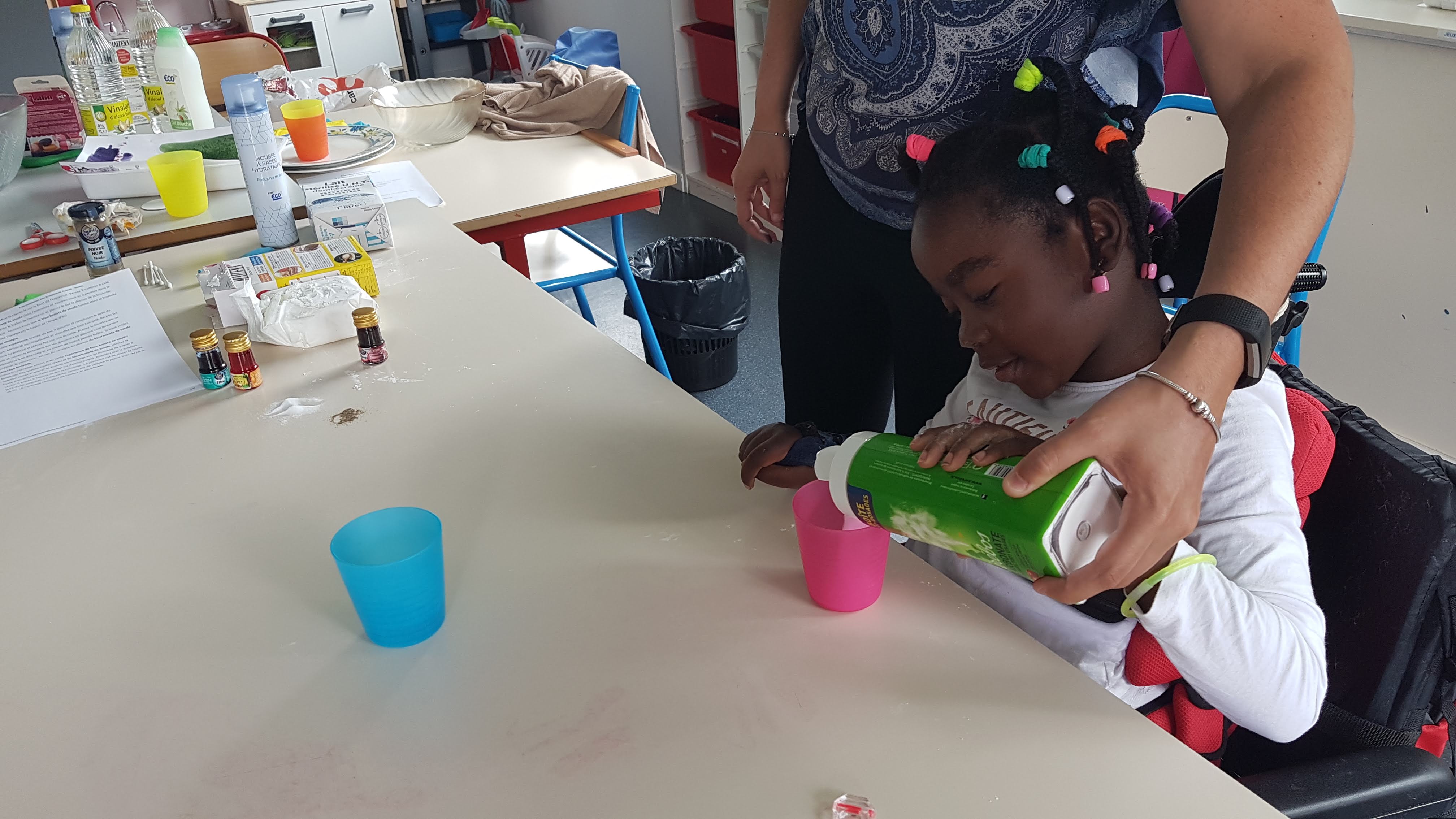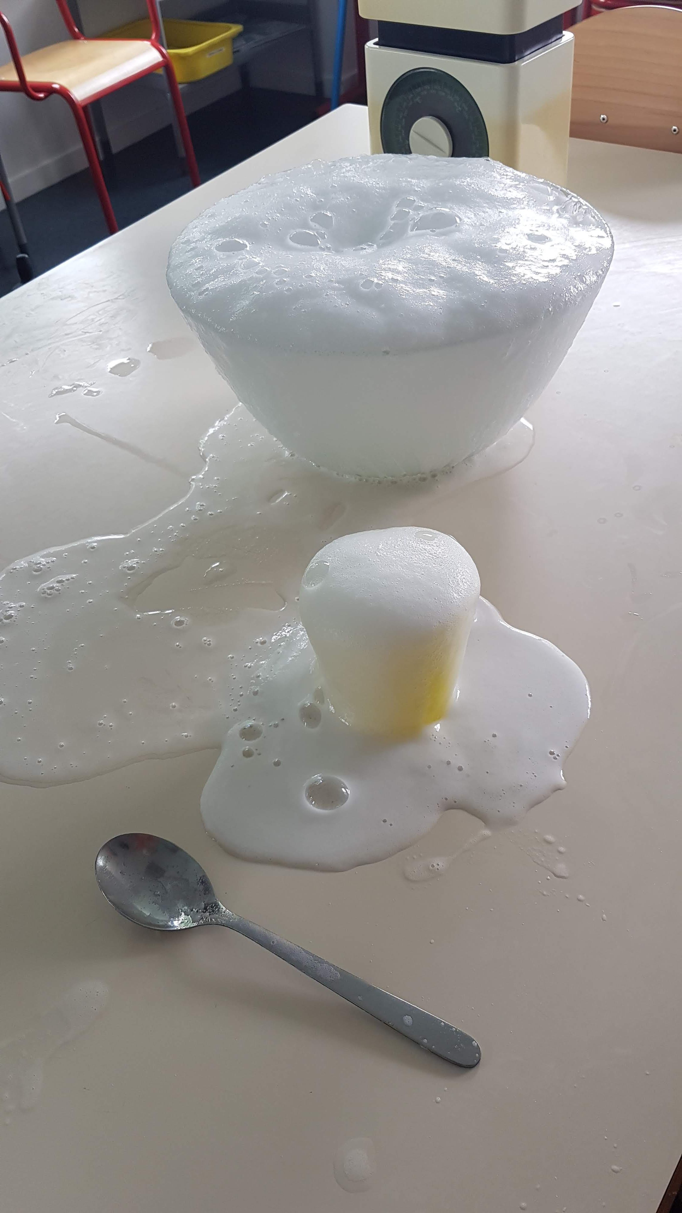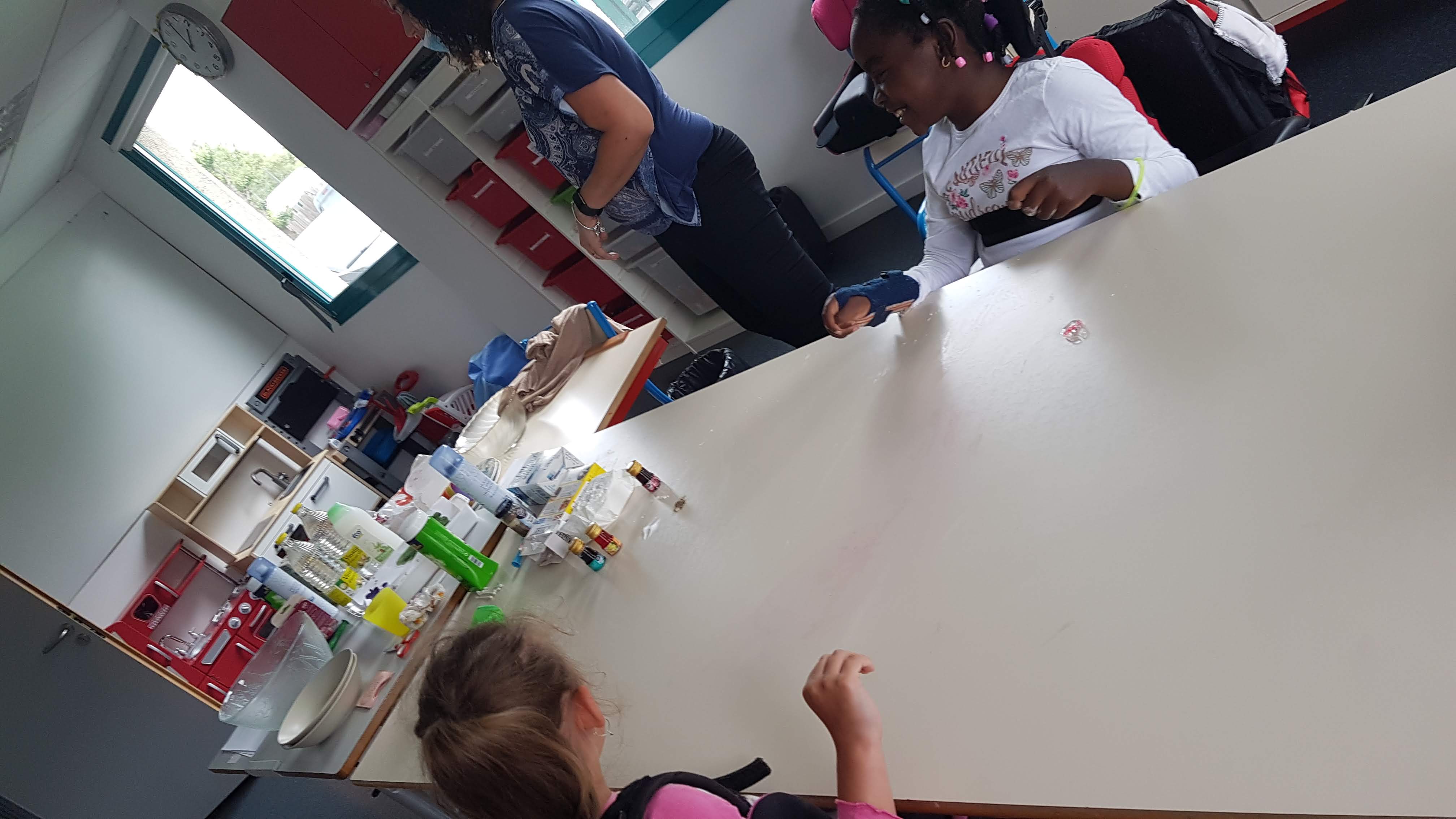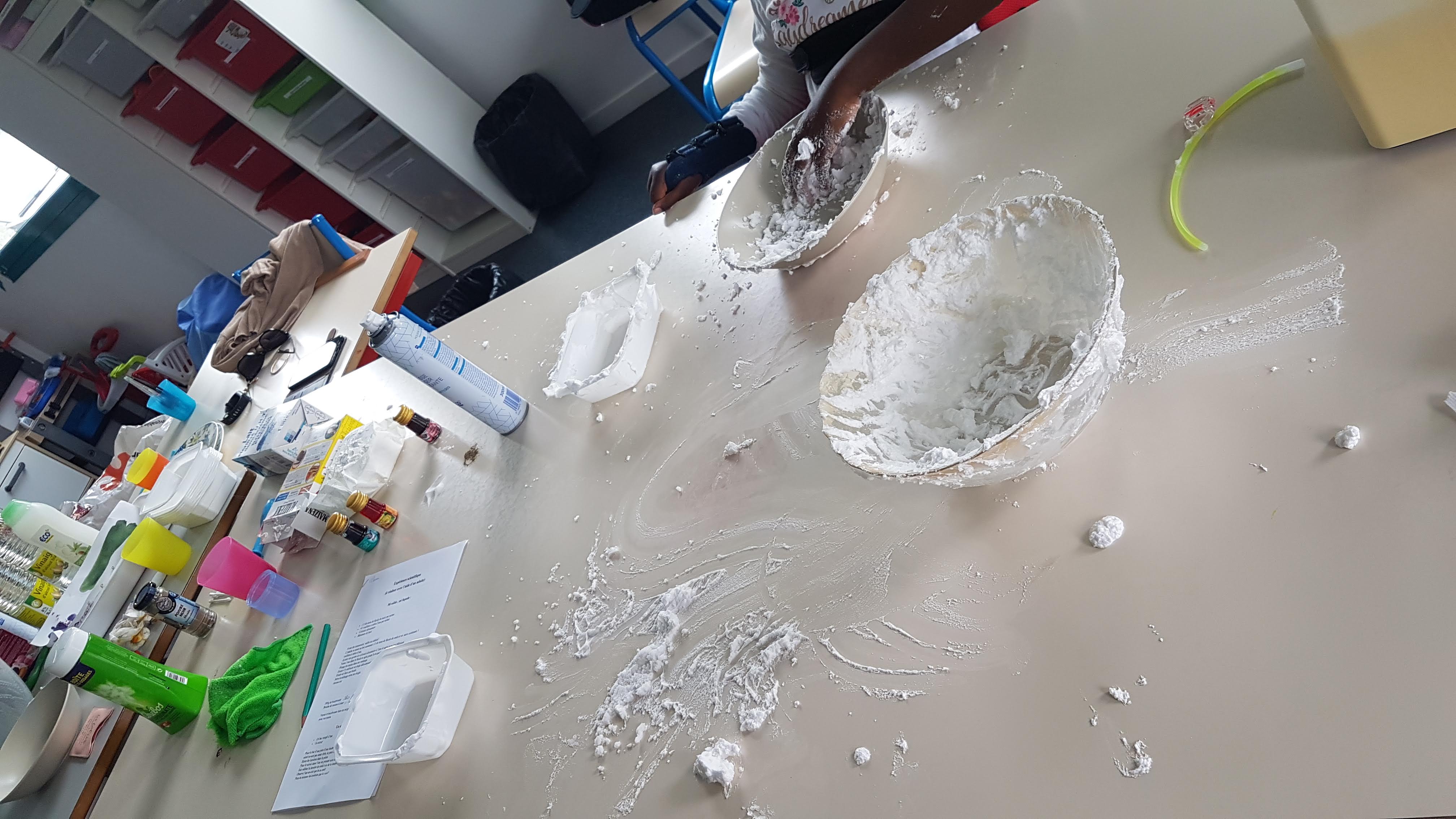Un après-midi expériences scientifiques pour Milana et Sublime avec plus ou moins de réussite mais surtout beaucoup de réussite…Mi-solide/mi-liquide, neige maison, lait magique, soirée mousse, le ballon gonflé sans souffler et la lampe lave….bicarbonate, liquide vaisselle, colorant, vinaigre blanc, huile, maïzena… bref on a tout essayé….