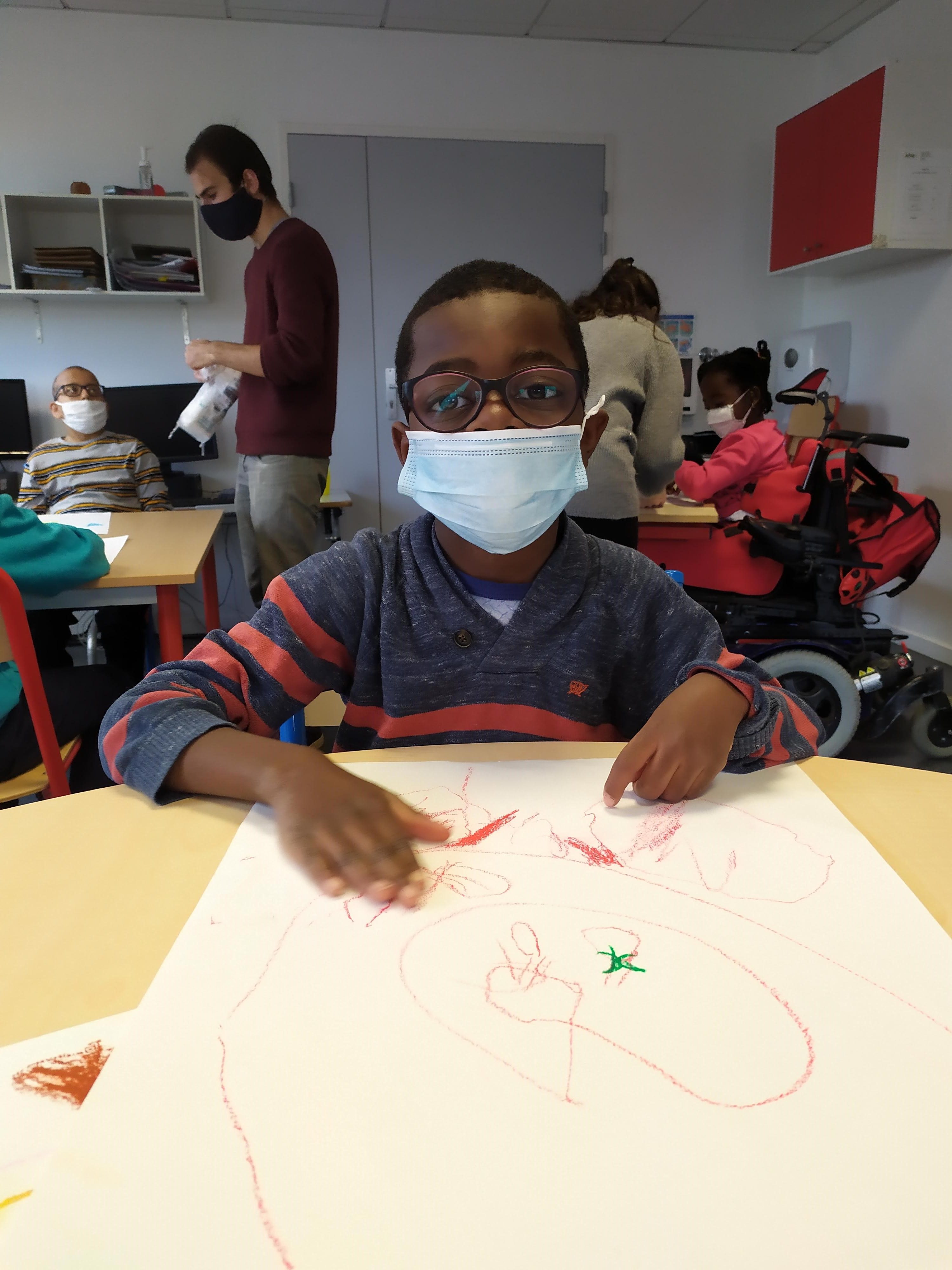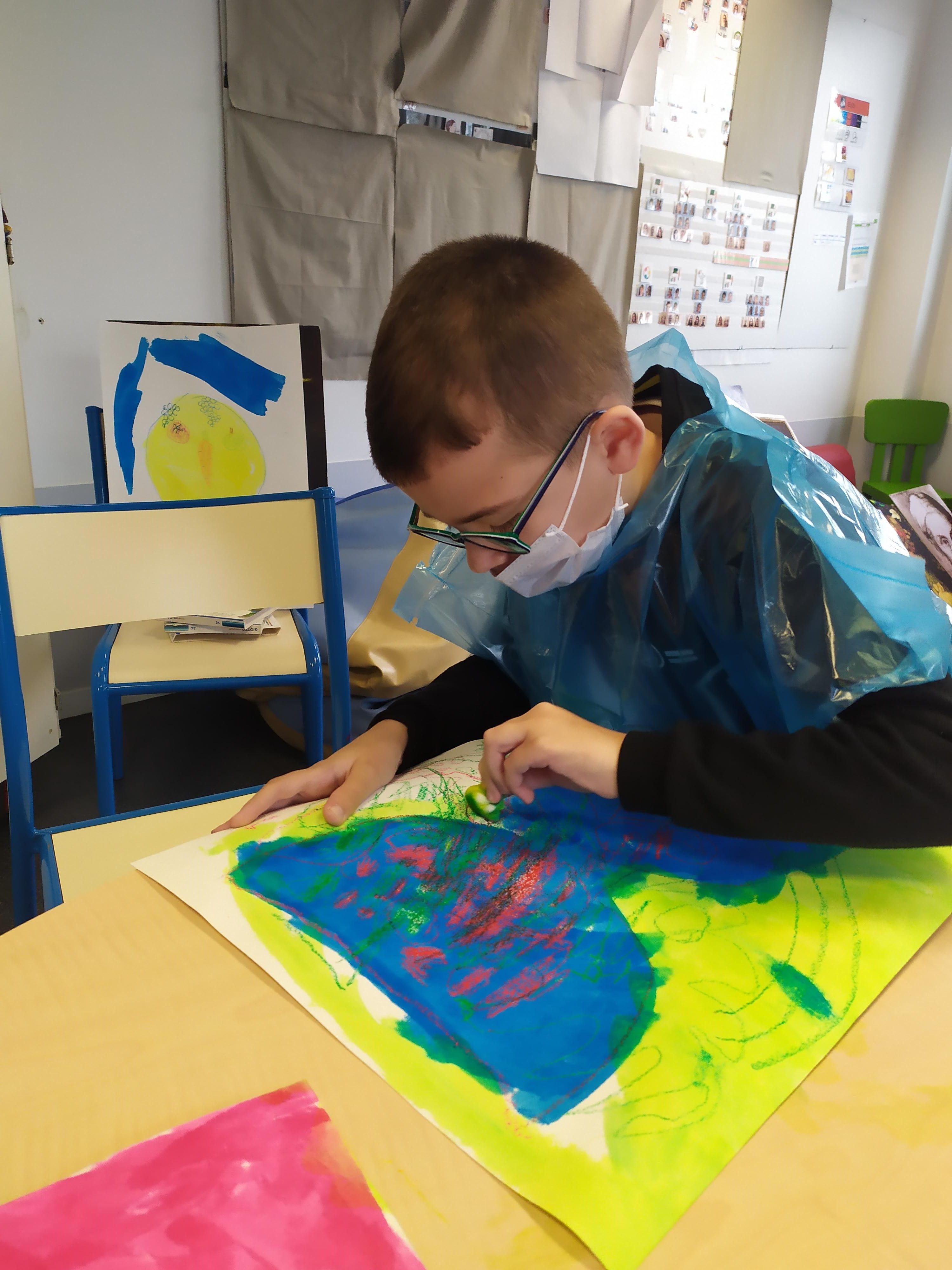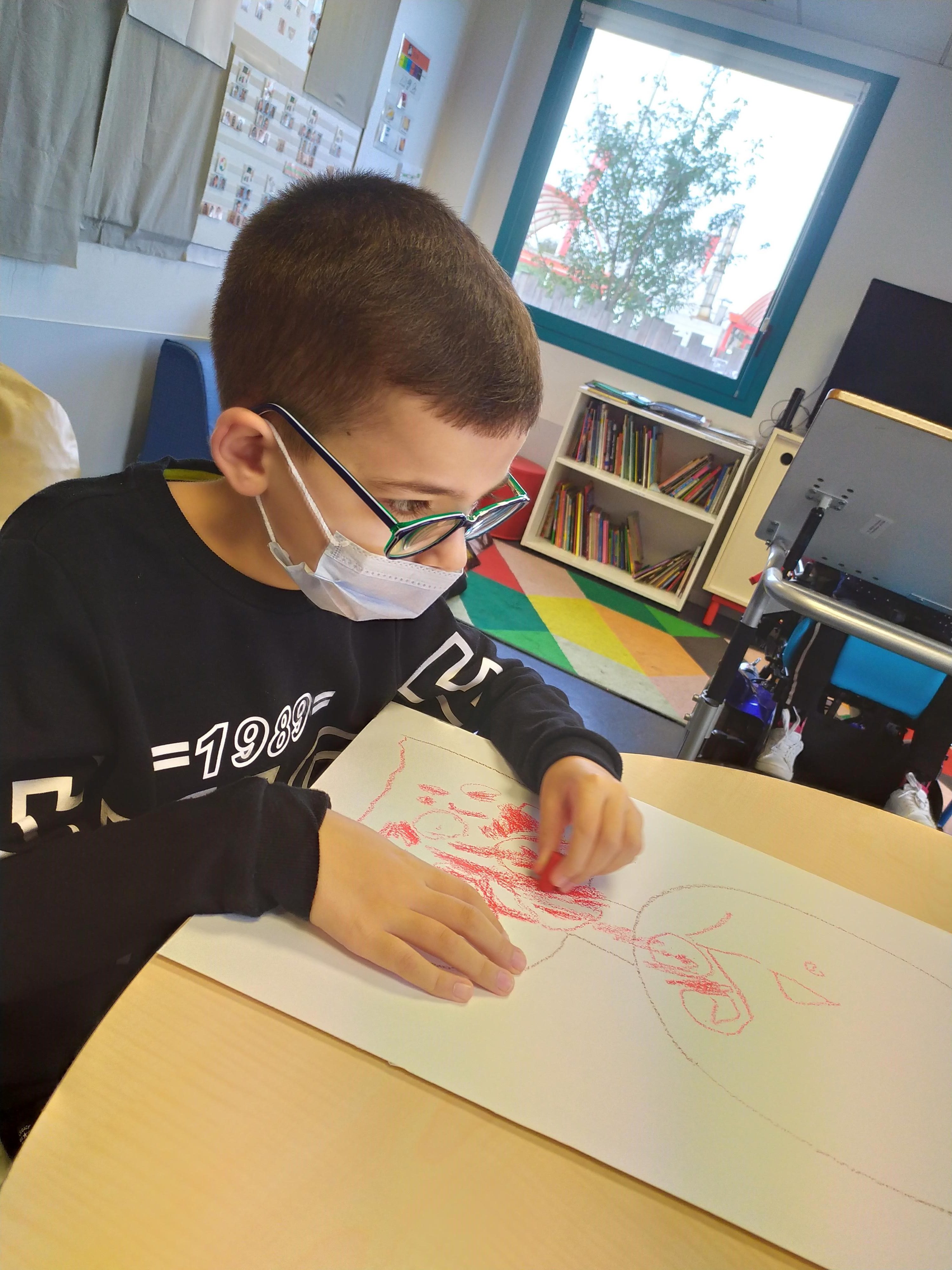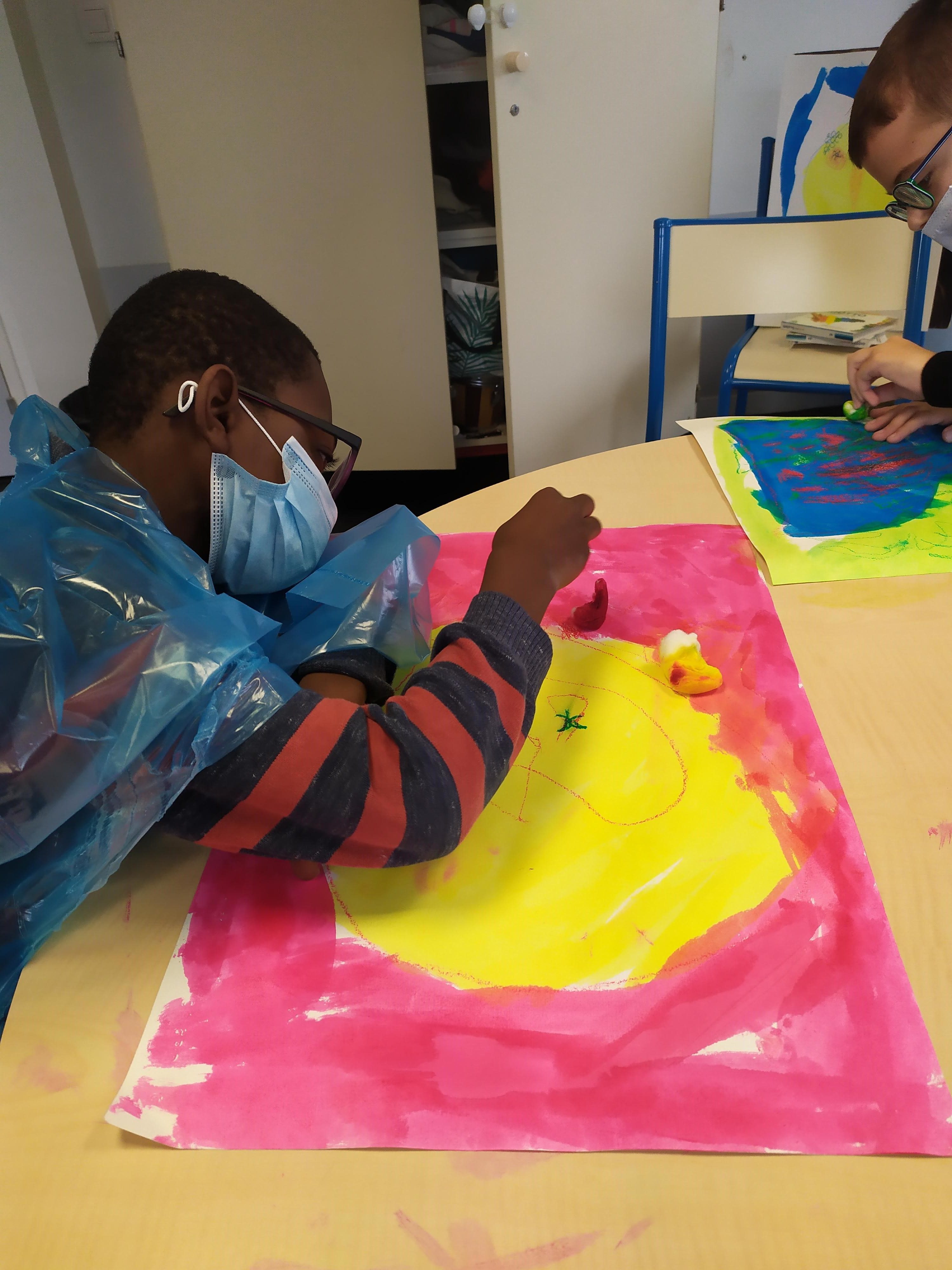 Aaron, Iyad, Gaspard, Sublime, Audrey, Jean, Rayan, Youcef ont créé leurs propres œuvres en s’inspirant de l’artiste. Les enfants ont utilisé des pastels et de l’encre pour les réalisations.
