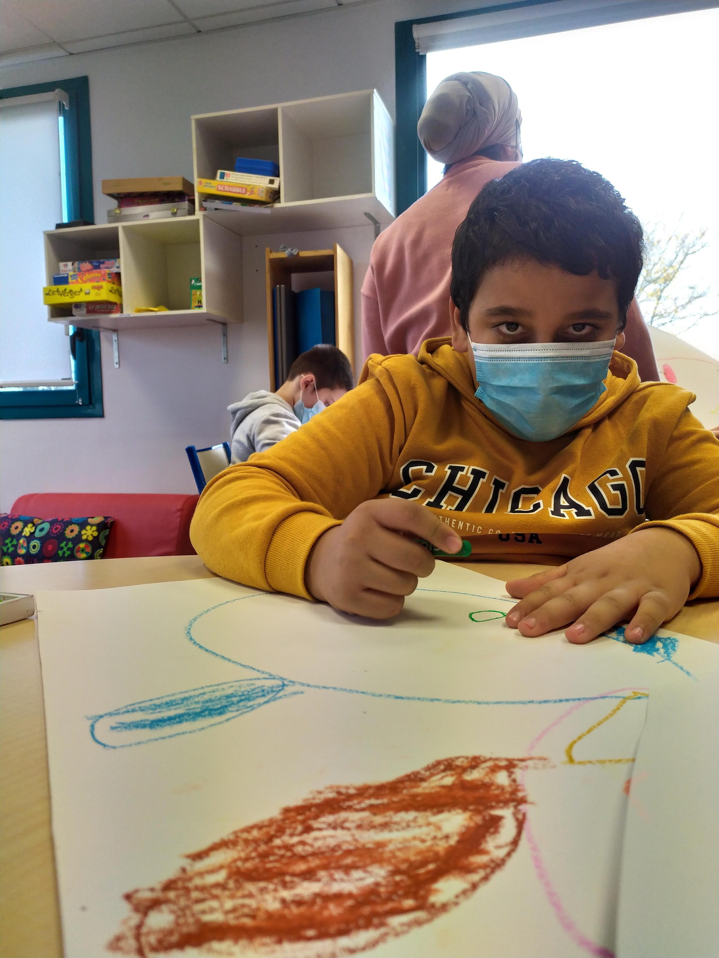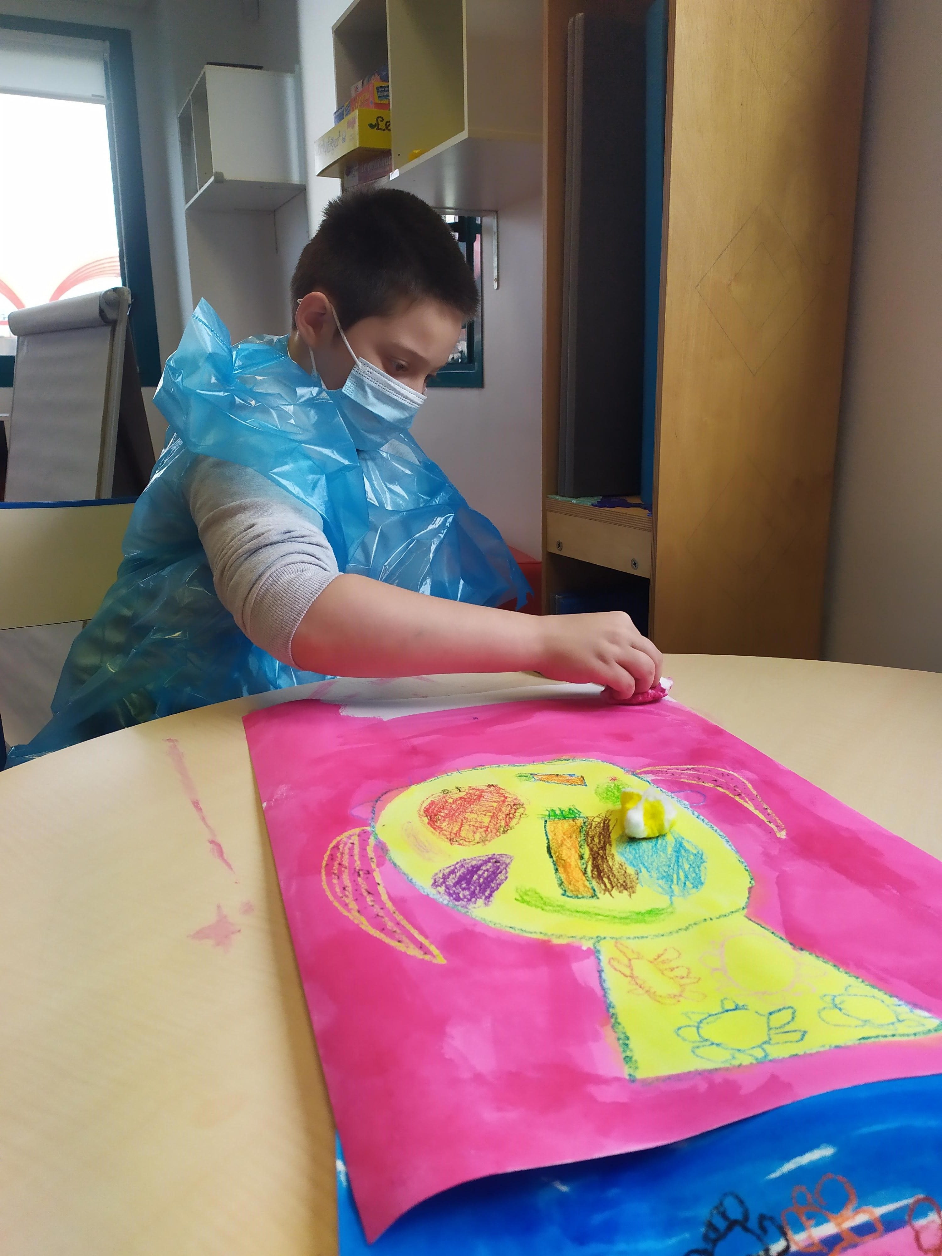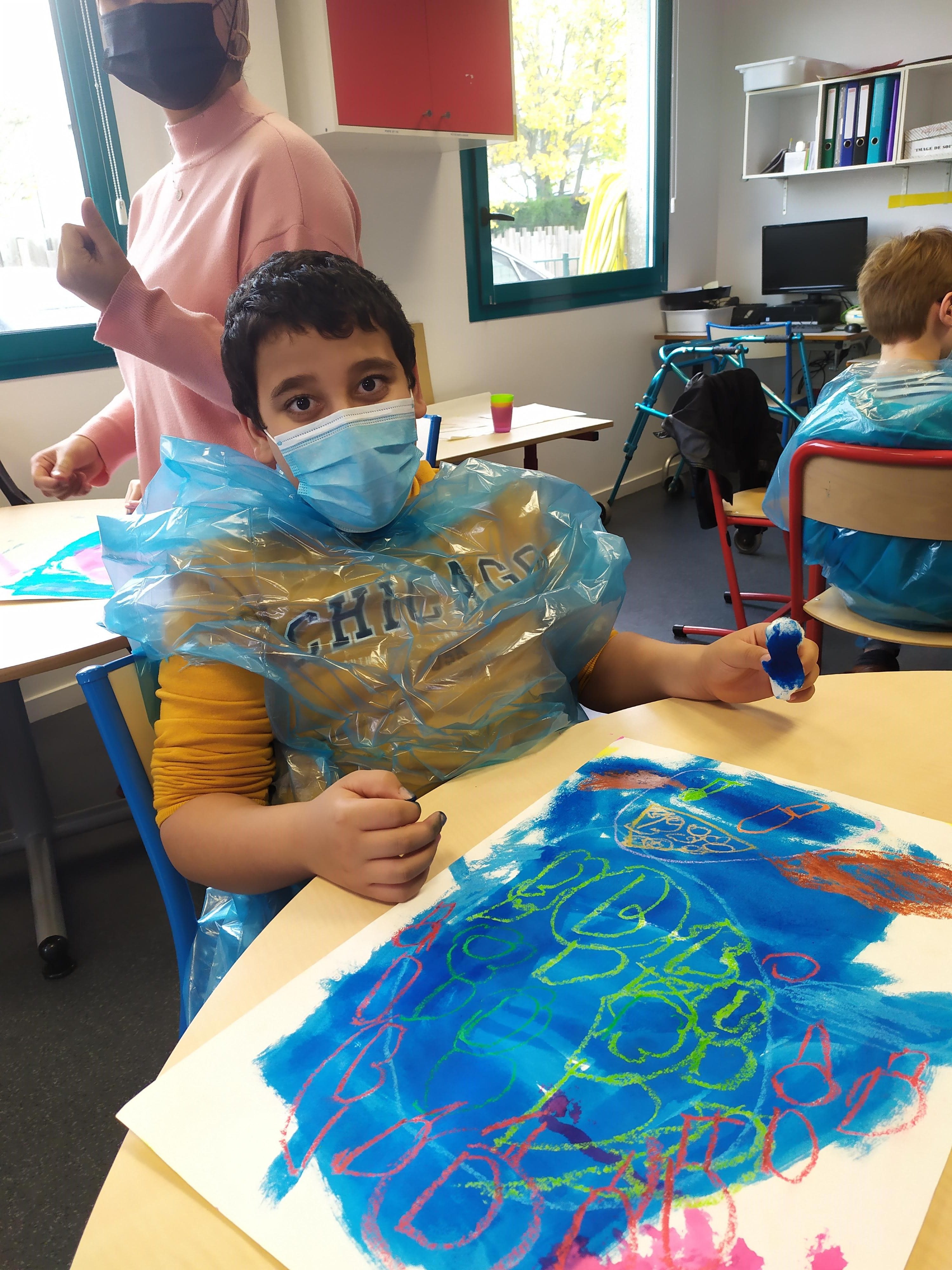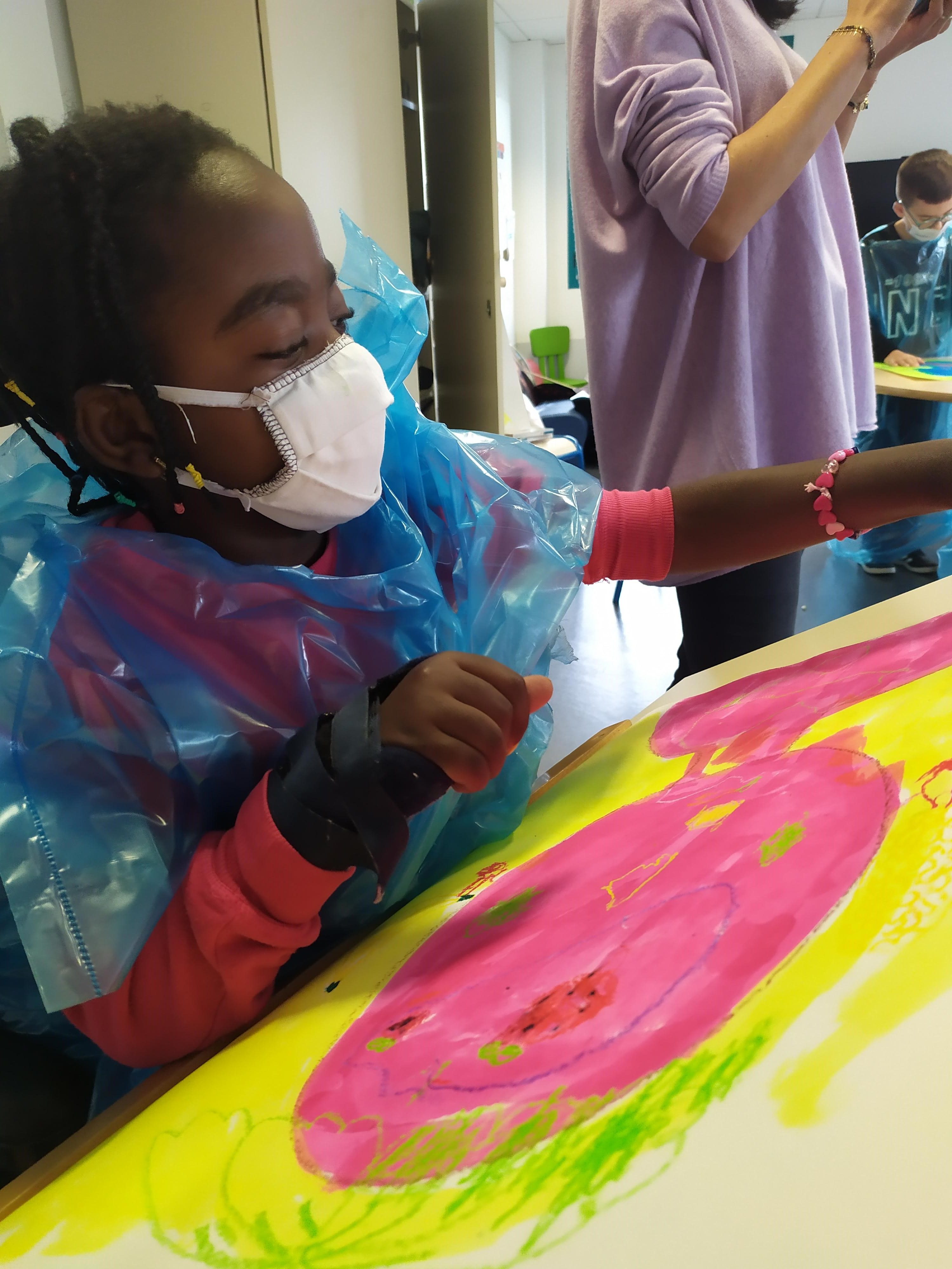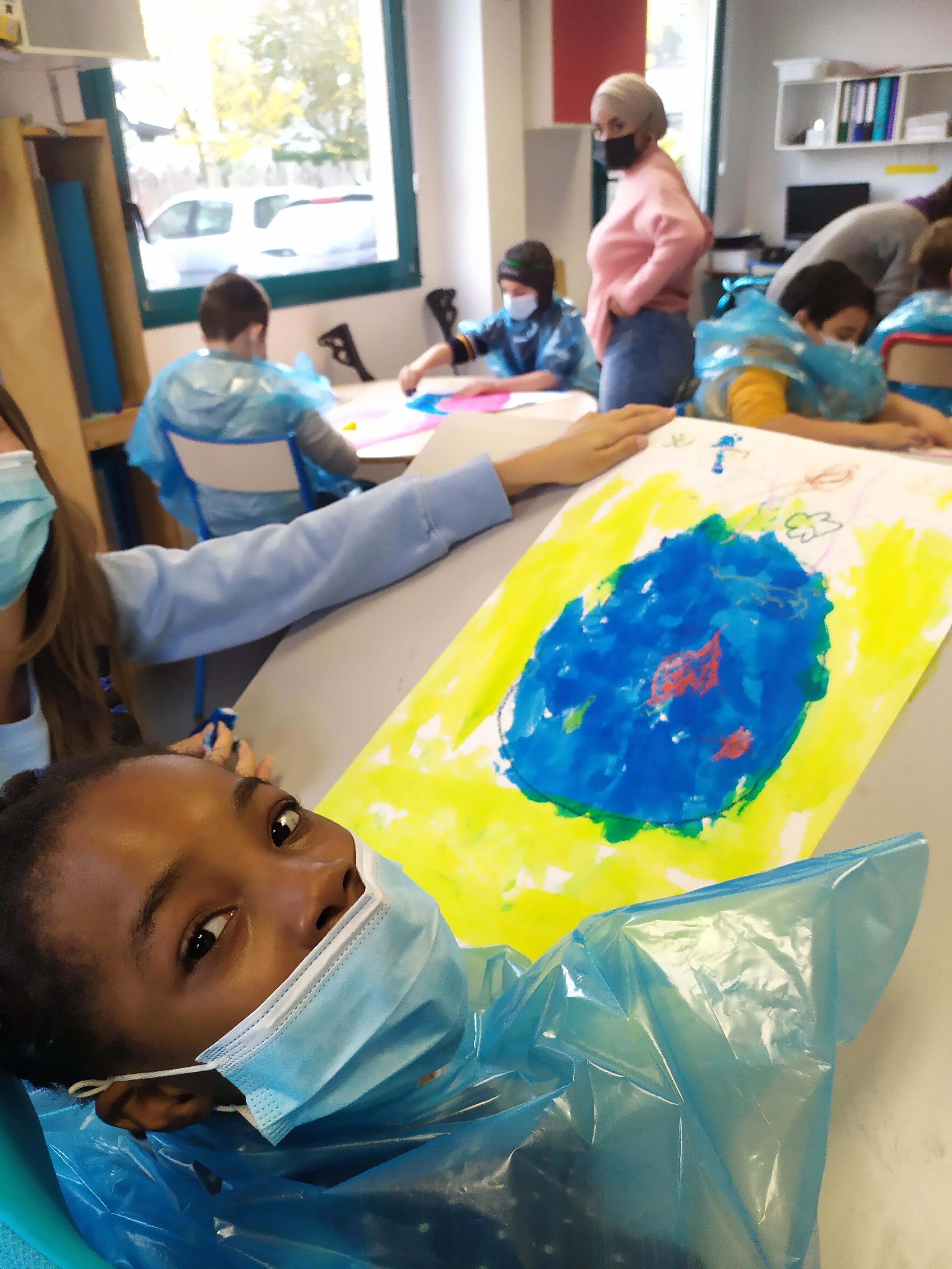 Aaron, Iyad, Gaspard, Sublime, Audrey, Jean, Rayan, Youcef ont créé leurs propres œuvres en s’inspirant de l’artiste. Les enfants ont utilisé des pastels et de l’encre pour les réalisations.