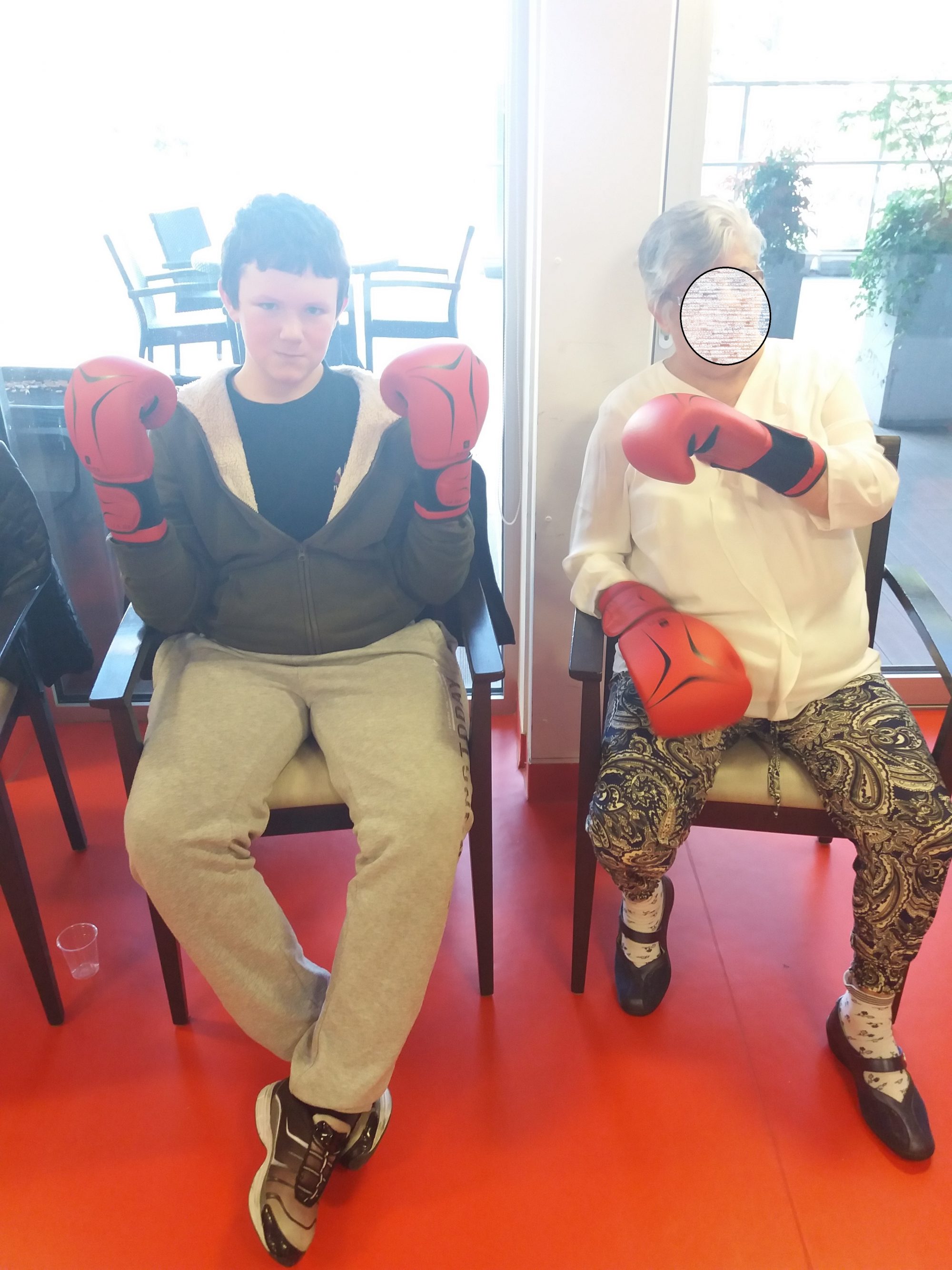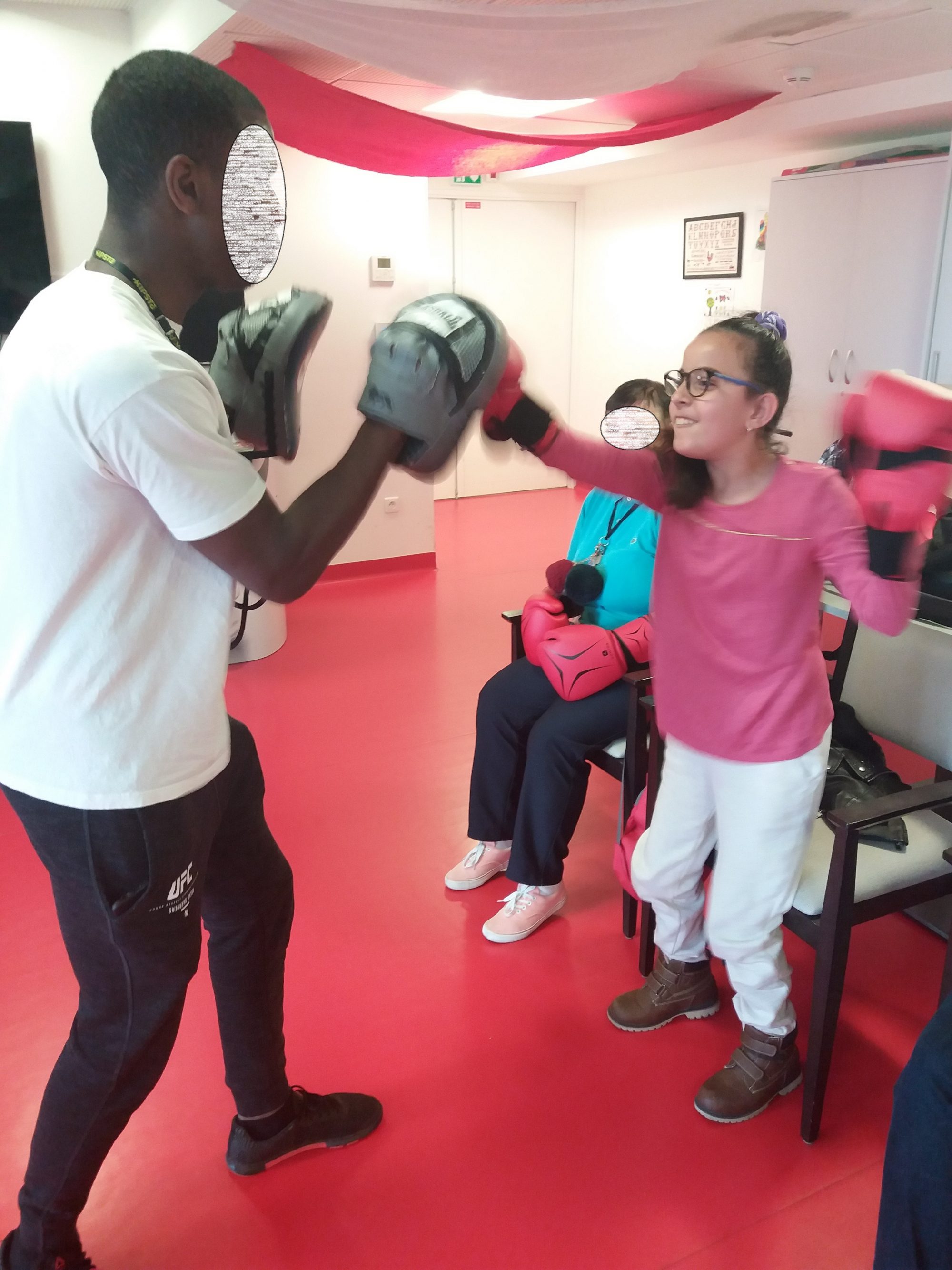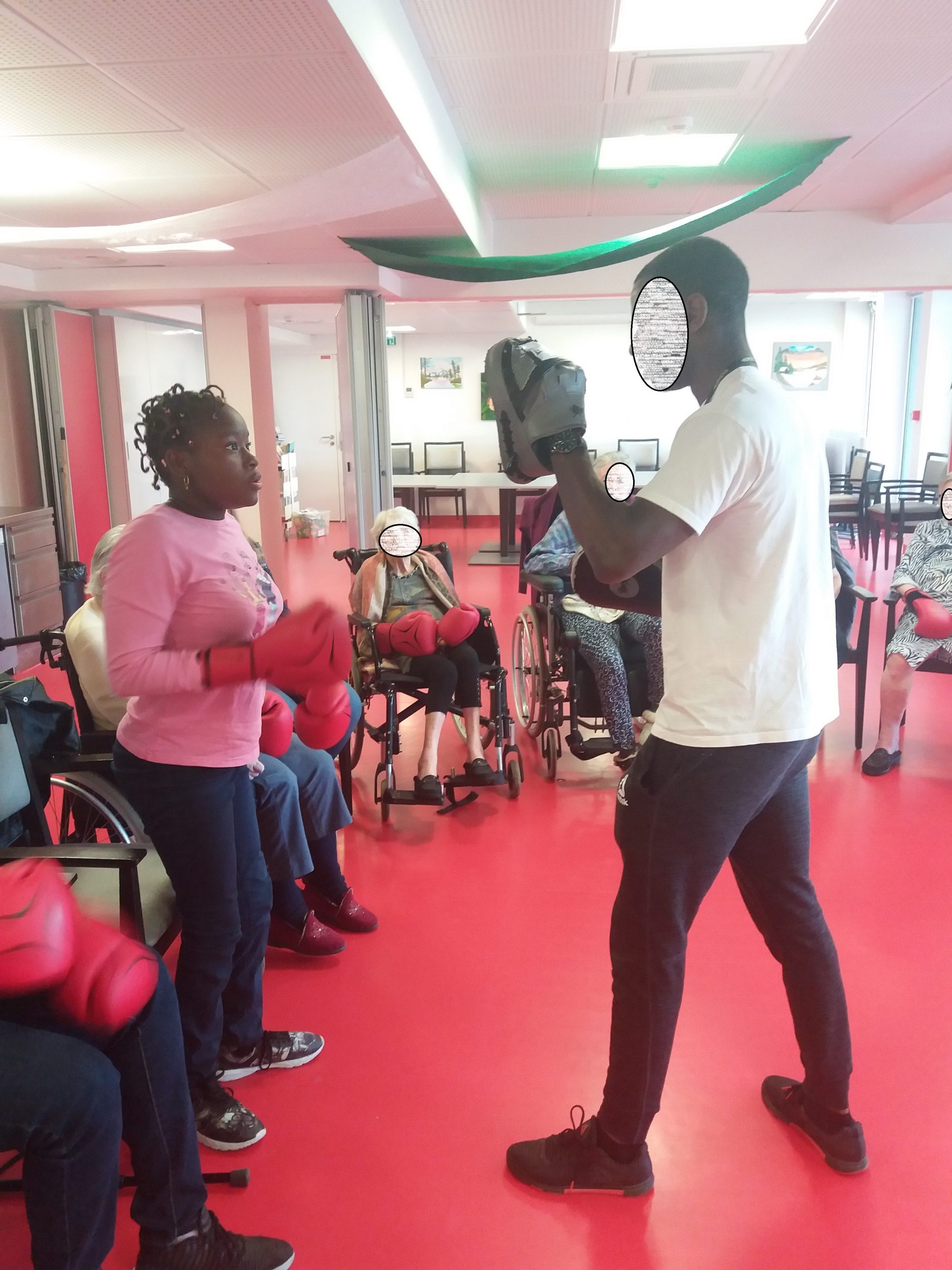 Ce mercredi s’était boxe avec Loïc de l’association l’ARTISTE. Échauffement, pratique suivi d’un retour au calme pour les résidents de l’EHPAD et nos jeunes de l’IEM.
