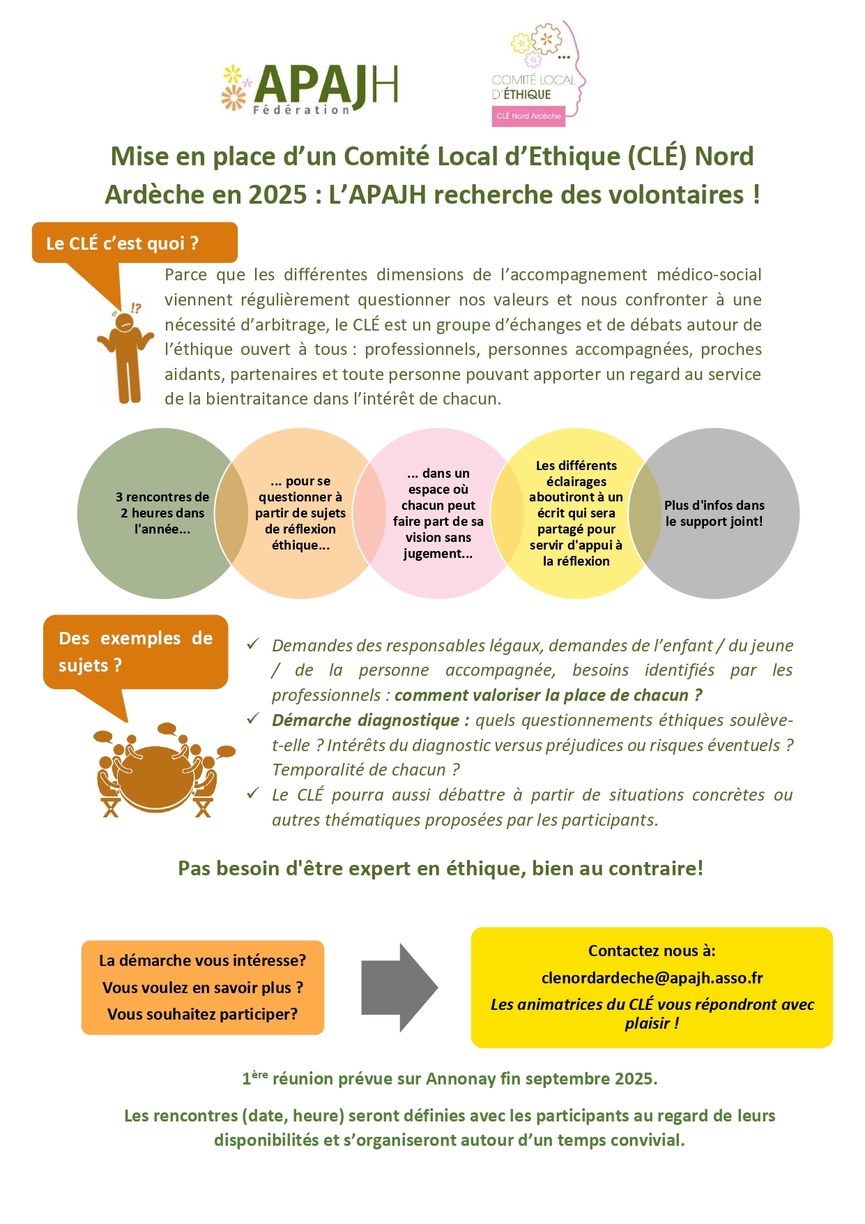 AccueilActualités 353 0 Mise en place d’un Comité Local d’Ethique (CLÉ) Nord Ardèche en 2025 : L’APAJH recherche des volontaires ! Cliquer ici pour ouvrir le dépliant CLÉ Nord Ardèche