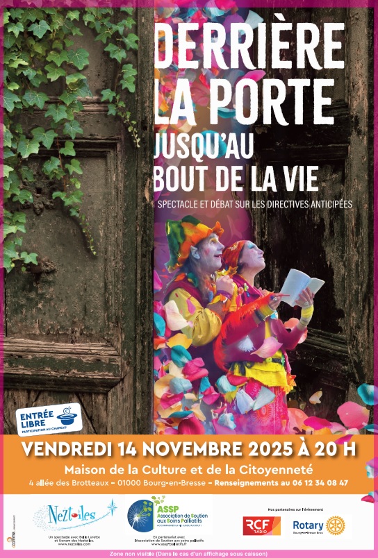 Les acteurs- art-thĂ©rapeutes de la Compagnie Neztoiles vous prĂ©senteront en douceur un spectacle afin de faire connaĂ®tre les directives anticipĂ©es puis un mĂ©decin de soins palliatifs ouvrira le dialogue sur ce sujet important , le dialogue se fera d’une manière lĂ©gère et dĂ©calĂ©e.