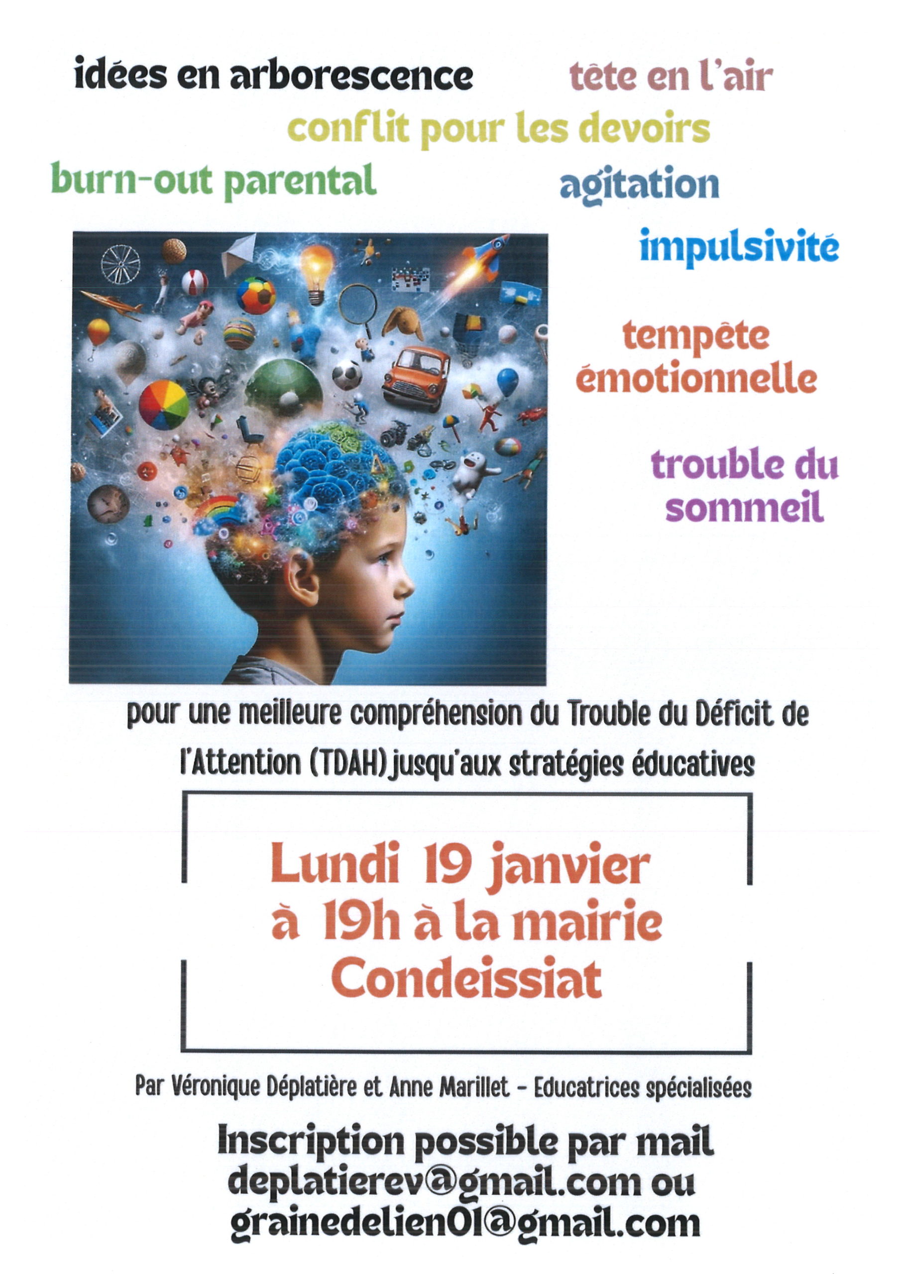Actualités 6 0 🗓️Lundi 19 janvier à Condeissiat : Pour une meilleure compréhension du TDAH (Trouble du Déficit de l’Attention)
